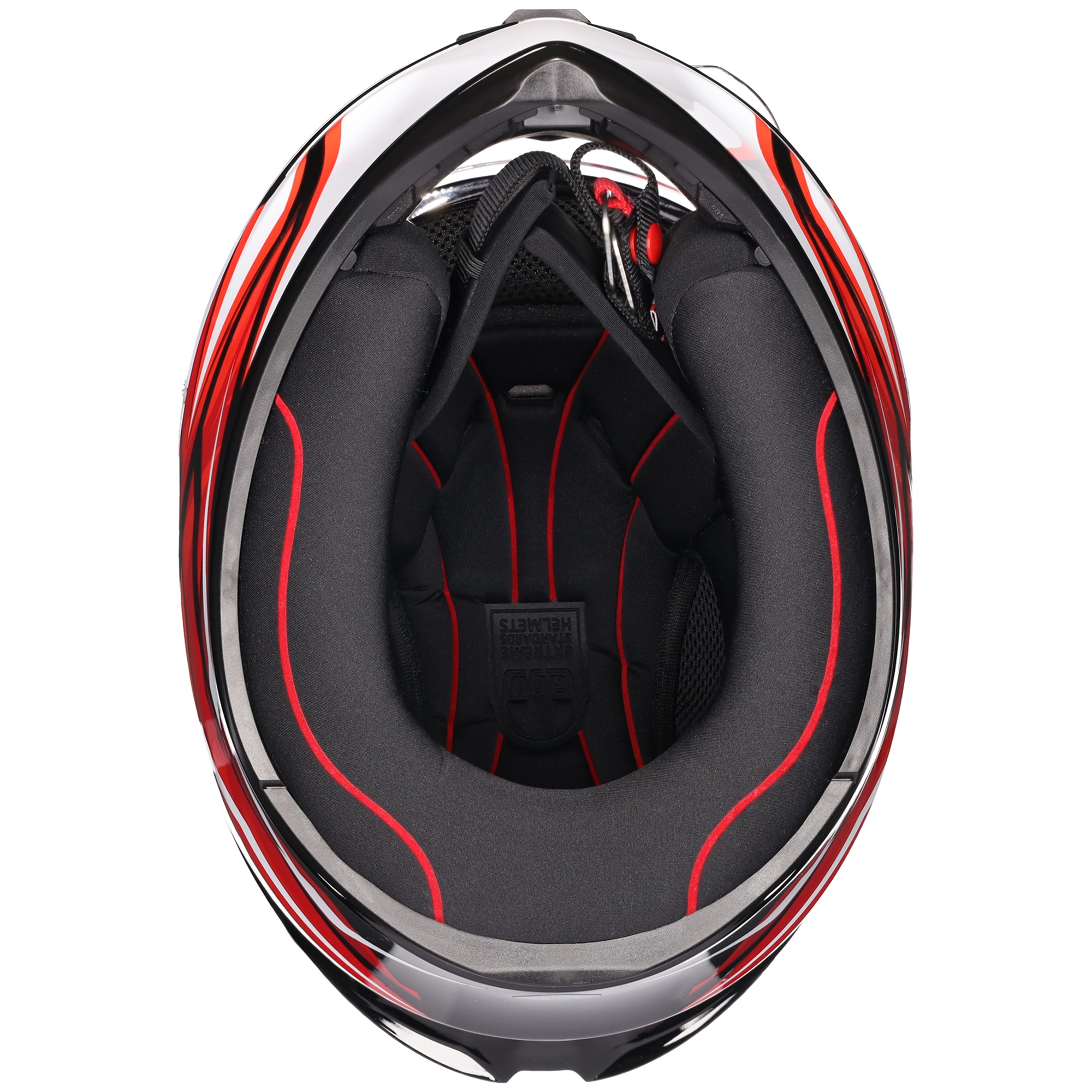 The aerodynamic shape of the AGV motorbike helmet shell is made with a high-resistance thermoplastic material. The front air vents have been developed through racing experience and the new Aero Spoiler has been designed in the wind tunnel. When combined, this maximises performance and provides stability, even at high speeds in sports riding.
