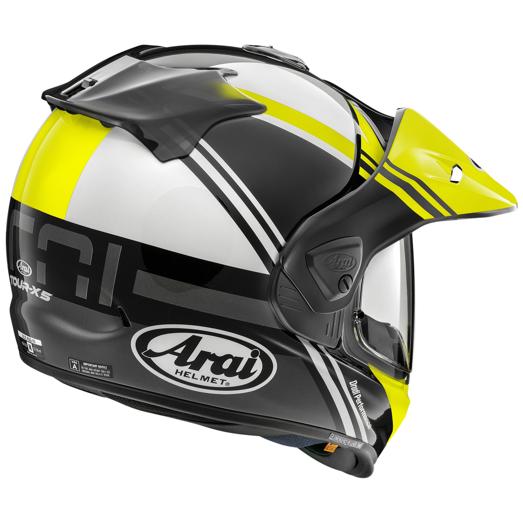 The visor system and visor are one of the key changes on the Tour-X5. The VAS-A visor system, derived from the VAS-V system developed for the Arai RX-7V race helmet, has been designed to maximise Glancing-Off performance. This means there is more surface area to ‘glance off’ impact energy whilst offering easy installation and removal of the visor and peak. The visor itself has been designed for increased visibility and Glancing-Off performance. As with all Arai helmets, it has a Max Vision visor and an anti-fog Pinlock insert which can easily be installed. The VAS-A visor system also makes it easier to switch your helmet style up easily and without tools. Choose between Adventure, Off-road and On-road wherever you go.