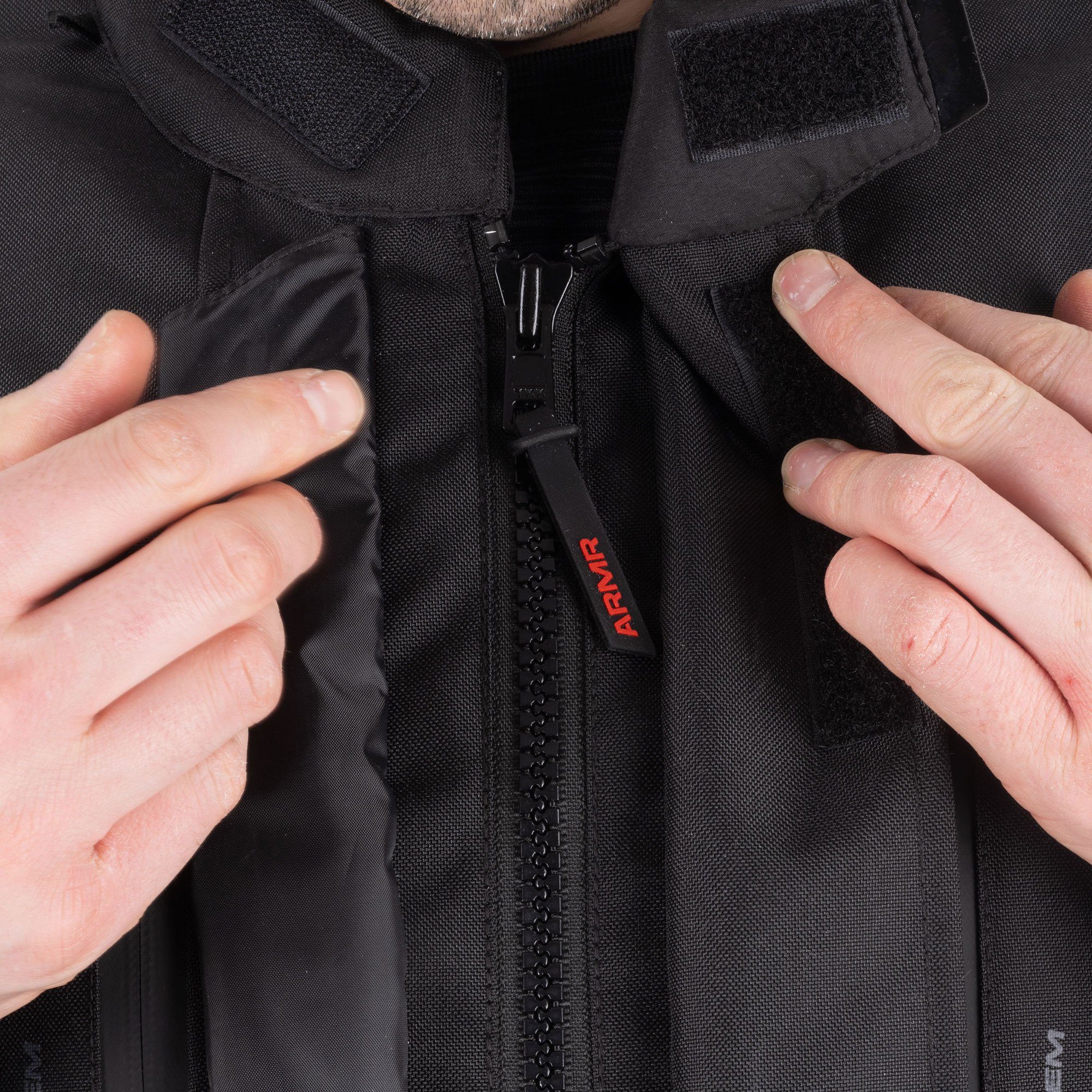 The ARMR motorbike jacket is also packed with safety features developed to keep you safe. You will find CE Level 1 protectors in the shoulders and elbows (back protector available separately), and when combined with reinforcements it results in a CE A rating for the waterproof touring motorbike jacket. Available in a range of colours to match any riders gear, bike and personal taste.