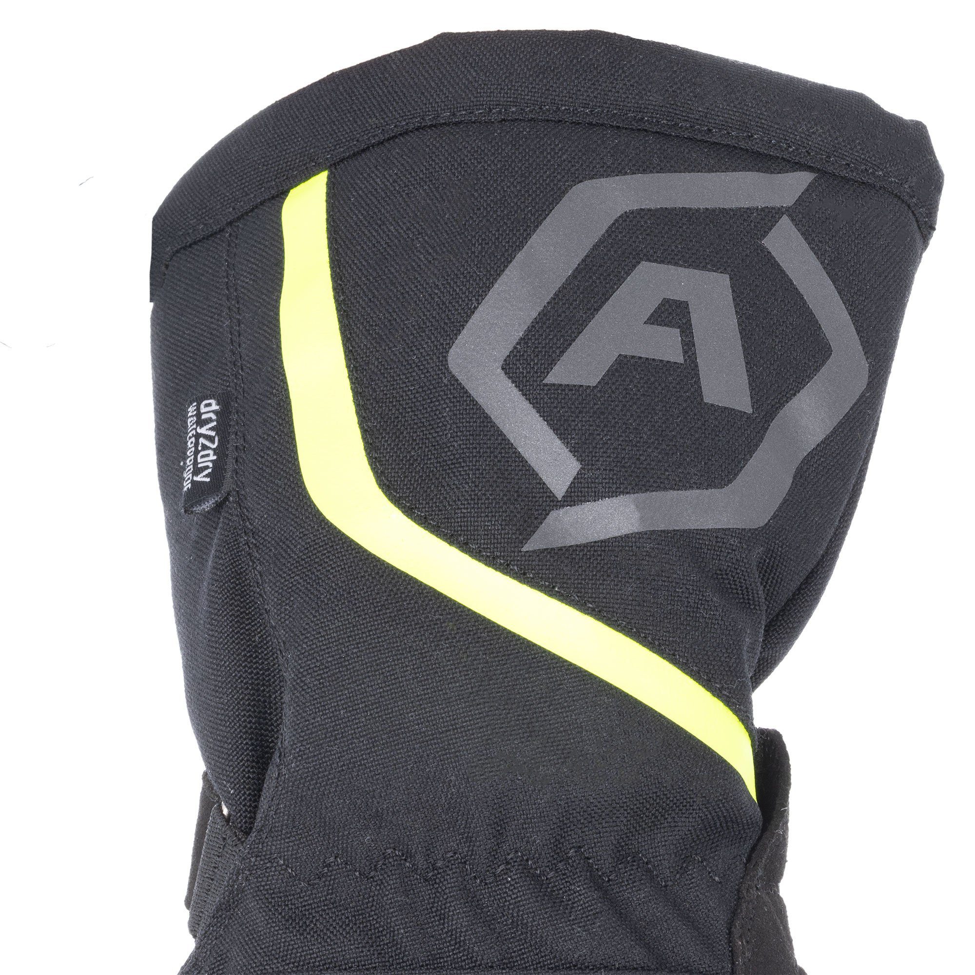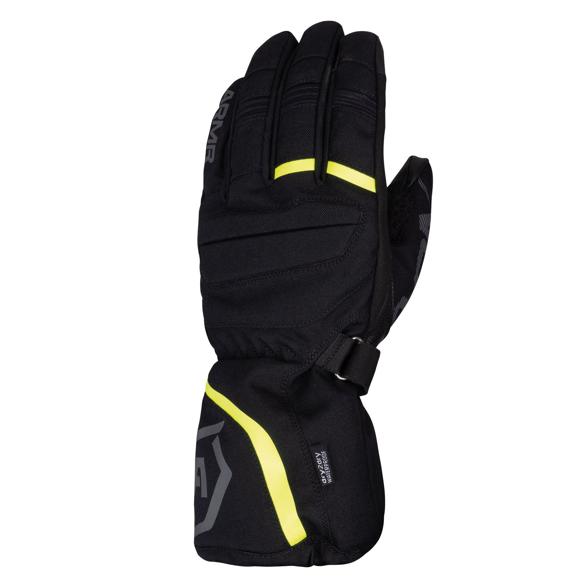 The ARMR Kiso 4.0 WP motorcycle gloves are ideal for riders looking to stay warm, dry and comfortable during harsh weather riding. The riding gloves feature a DRYGUARD waterproof membrane, 3M™ Thinsulate™ insulation and quick release cuff adjustment. The affordable yet protective waterproof gloves have been designed with full leather palm protection and with an Amara overlay for extra grip. The fully waterproof construction gives this glove an ideal blend of comfort and protection, perfect for all weather riding.