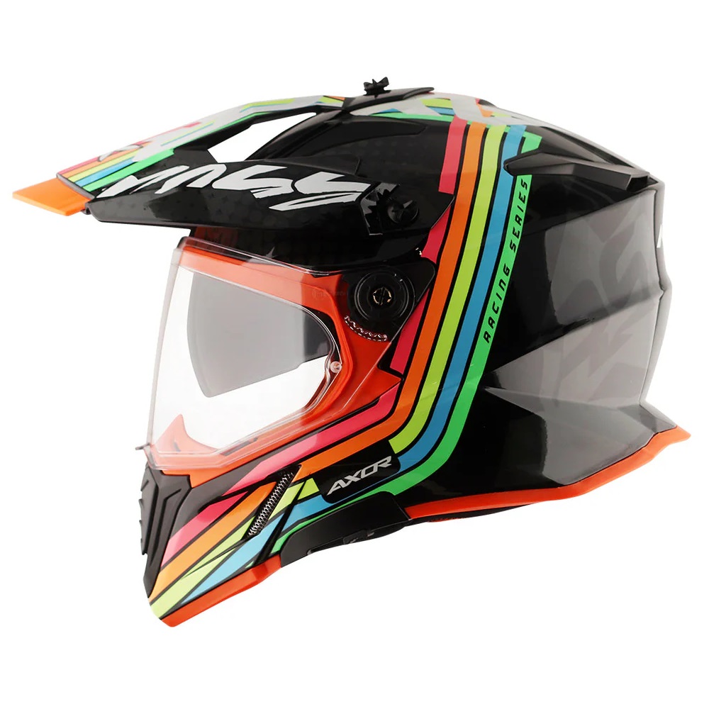 The Axor X-Cross X2 adventure motorcycle helmet is great for riders who enjoy taking on both the on-road and off-road riding disciplines. The dual sport motorbike helmet excels no matter where you look to take on your next adventure. The peak and visor is fully removable, allowing you to convert the helmet into a full road helmet or off-road helmet instantly.