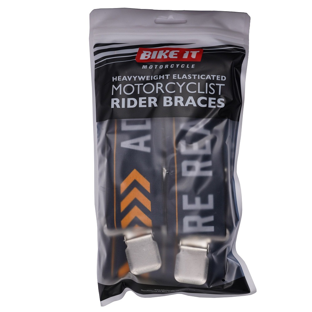 The Bike It motorcycle braces have been designed specifically for use with leather and textile motorcycle trousers. No longer will you forever be pulling your trousers up, eliminate the problem with a set of comfortable braces designed for riding.