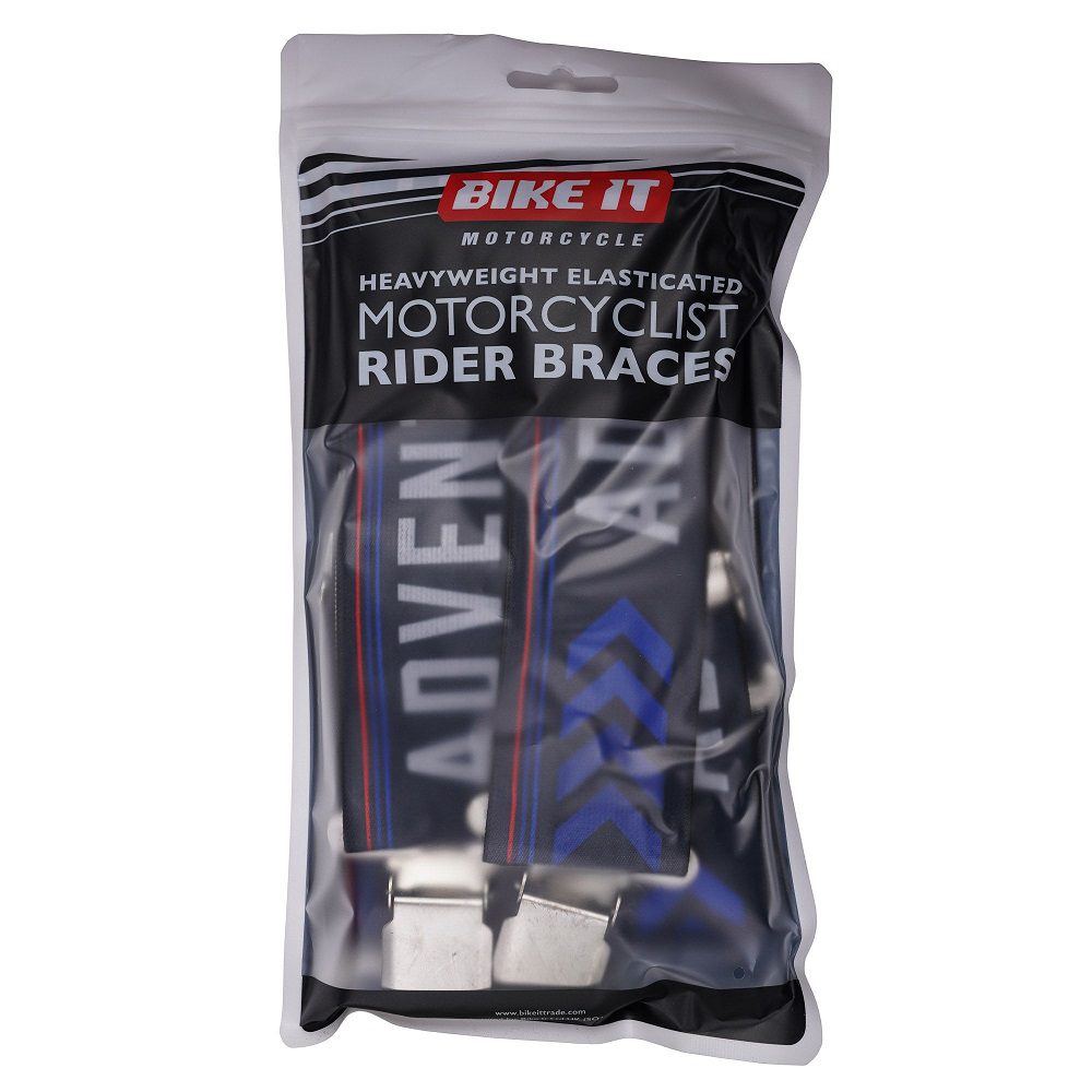 The Bike It Adventure motorcycle braces have been designed specifically for use with leather and textile motorcycle trousers. No longer will you forever be pulling your trousers up, eliminate the problem with a set of comfortable braces designed for riding. Available in a range of colours to match any riders gear, bike and personal taste!