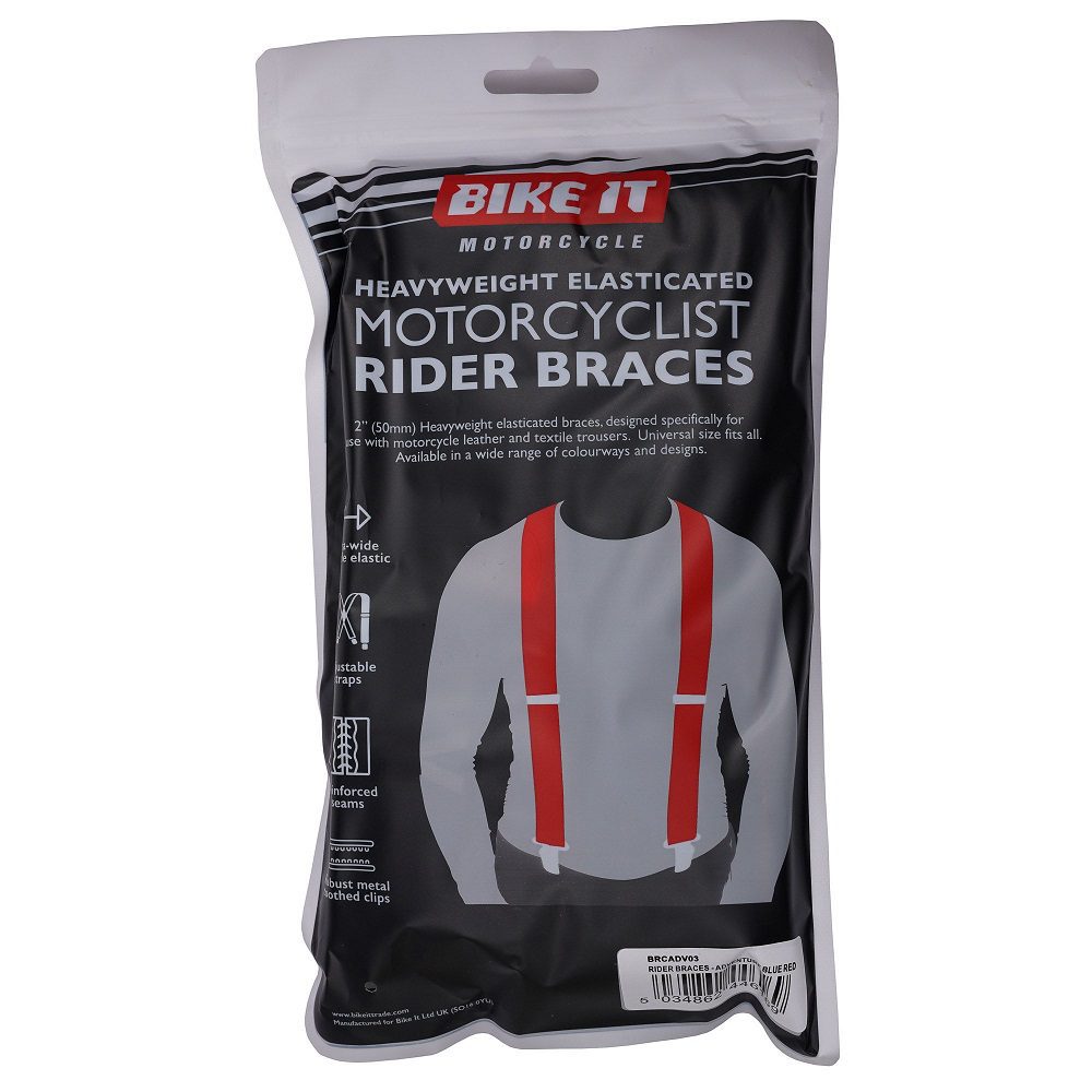 The Bike It motorcycle braces have been designed specifically for use with leather and textile motorcycle trousers. No longer will you forever be pulling your trousers up, eliminate the problem with a set of comfortable braces designed for riding.