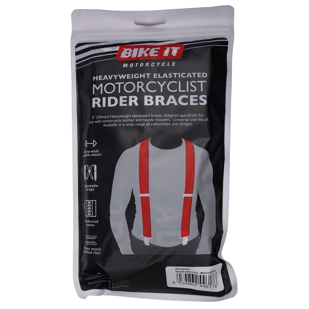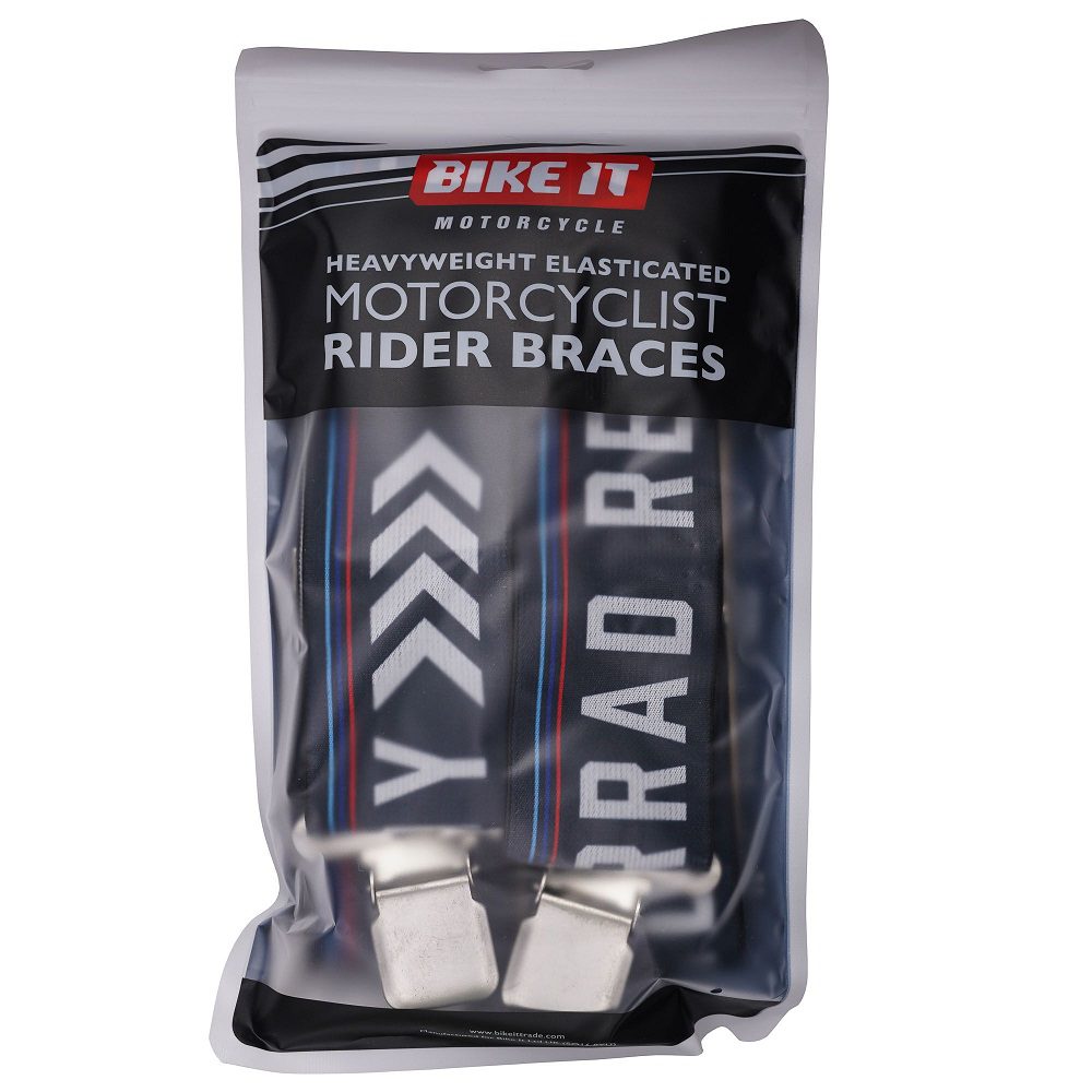 The Bike It motorcycle braces have been designed specifically for use with leather and textile motorcycle trousers. No longer will you forever be pulling your trousers up, eliminate the problem with a set of comfortable braces designed for riding.