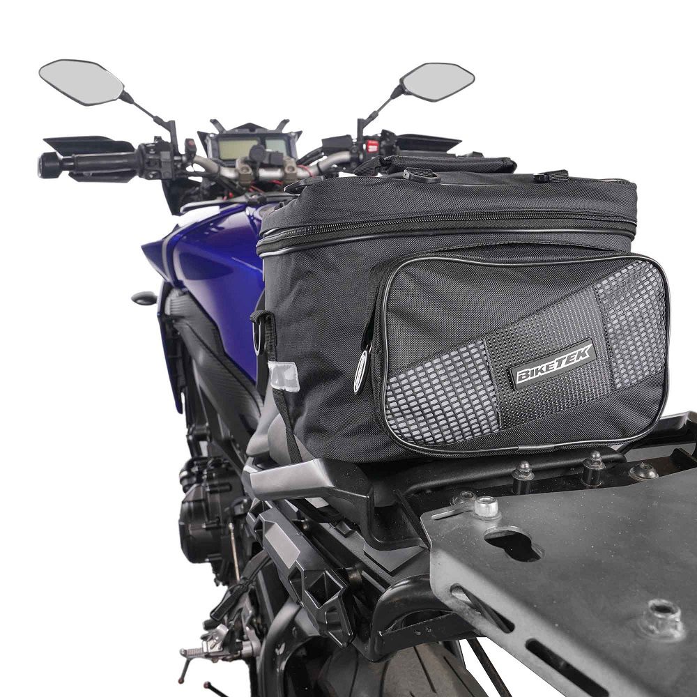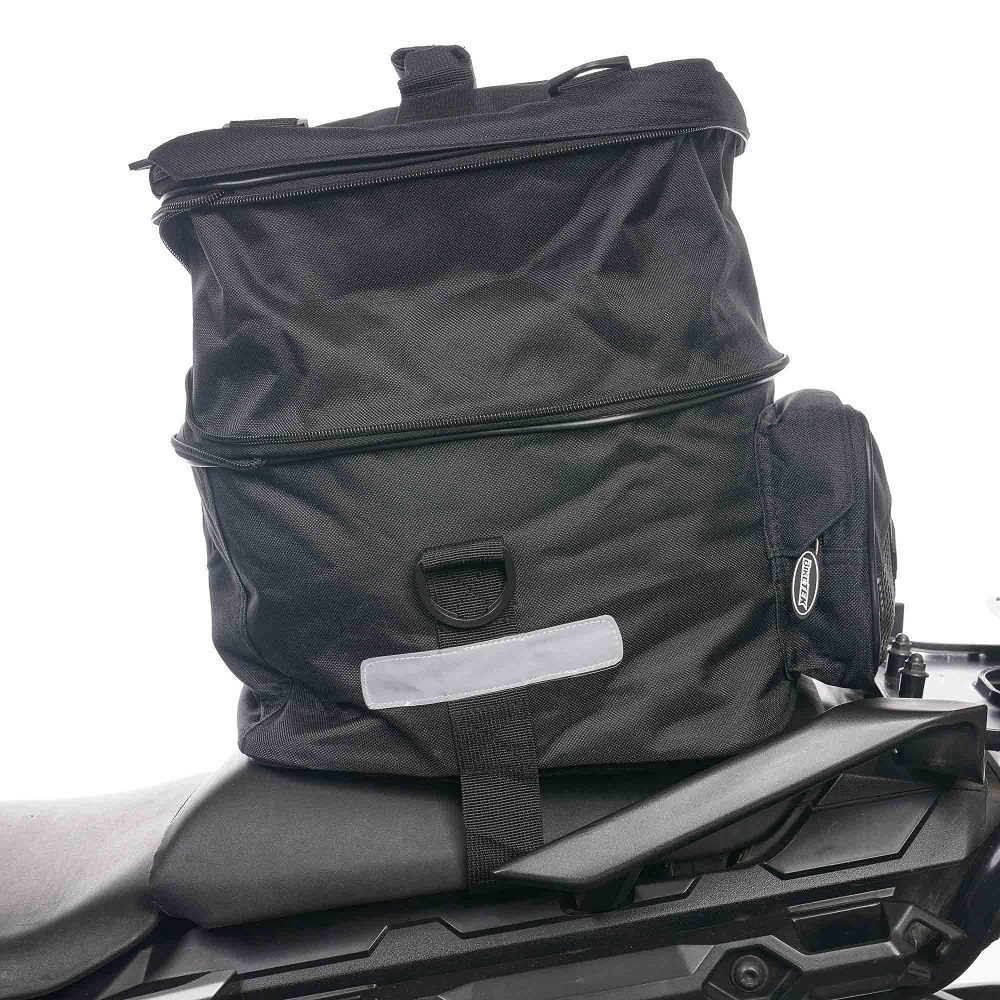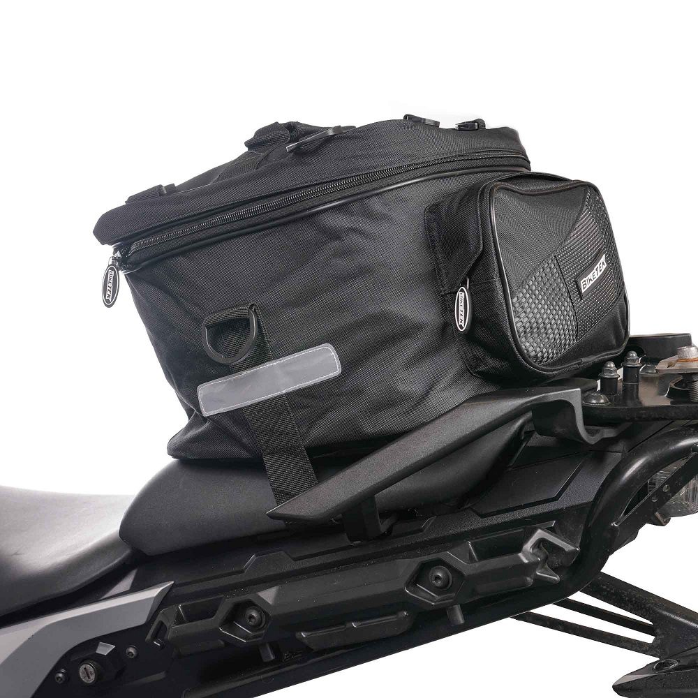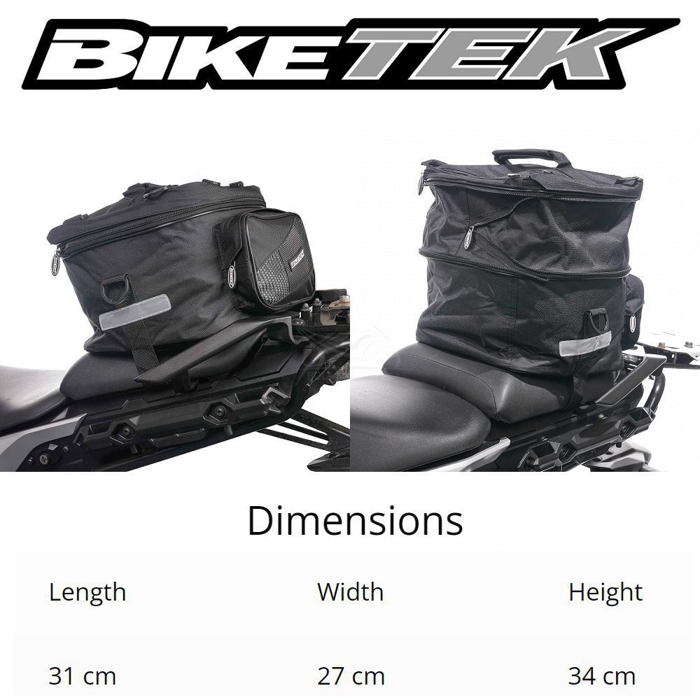 The BikeTek Expandable motorcycle tail pack is a traditionally designed motorbike tail bag with an expanding main compartment and zip-close side pockets offering a maximum capacity of 36 litres. It doubles up as a rucksack when off the bike, which is ideal for riders looking to carry their essentials and a little more with them on their journeys. A set of rain covers are provided, which helps to protect against harsh conditions if you’re caught out or have to travel in poor weather.