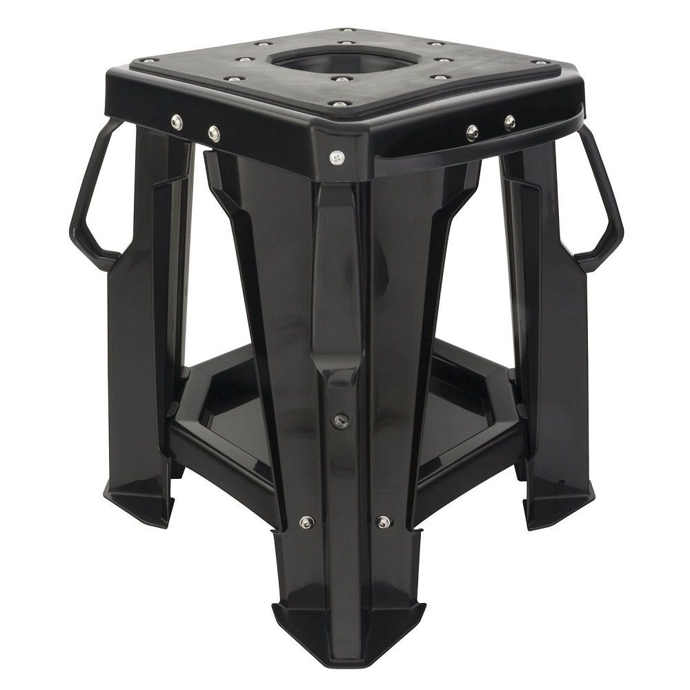 The BikeTek Pro MX black ridge motorcycle stand is a durable and robust injection moulded MX stand, perfect for avid off-road riders. A rubber mat surface delivers grip and is soft to your bike, while an access cutaway provides an easier time of maintenance and cleaning. The off-road motorbike stand is lightweight but extremely strong. Side handles allow for easy maneuvering, and an under tray is great at holding tools and parts while working on your bike.