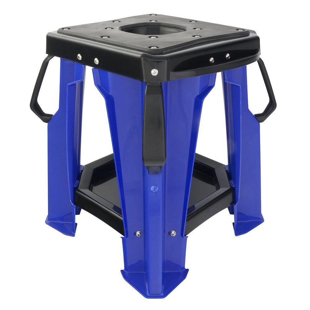 The BikeTek Pro MX blue ridge motorcycle stand is a durable and robust injection moulded MX stand, perfect for avid off-road riders. A rubber mat surface delivers grip and is soft to your bike, while an access cutaway provides an easier time of maintenance and cleaning. The off-road motorbike stand is lightweight but extremely strong. Side handles allow for easy maneuvering, and an under tray is great at holding tools and parts while working on your bike.