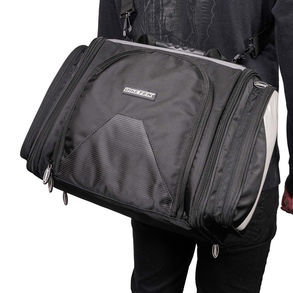 The Biketek Urbano motorcycle tail pack is fantastic for riders looking to carry their items with them while they ride around. A contoured motorcycle tail bag with an expanding main compartment alongside zip-close side pockets provide a maximum capacity of 30 Litres, more than enough for most!