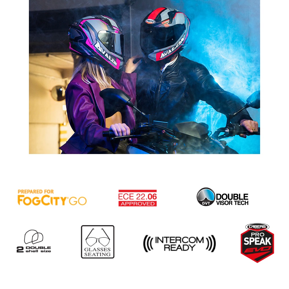 The Caberg Avalon X Punk full face motorcycle helmet is a sports inspired helmet shell, jam packed with technical features suitable for sports touring riders. Ideal for everyday use, the Caberg motorbike helmet also excels on long distance and challenging routes. A double visor system allows you to ride in all weather conditions, as the drop down sun visor helps battle sun glare and the anti-scratch and anti-fog prepared outer visor keeps maximum clarity at all times. Two outer shell sizes offer an excellent fit proportion between the shell volume and the riders head. Available in a range of colours to match any riders gear, bike and personal taste!