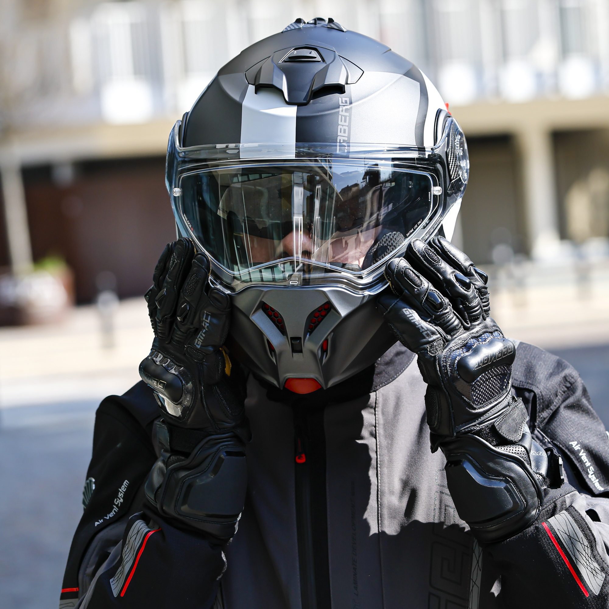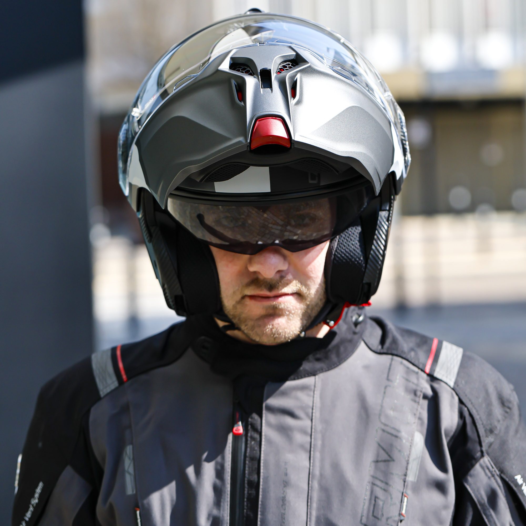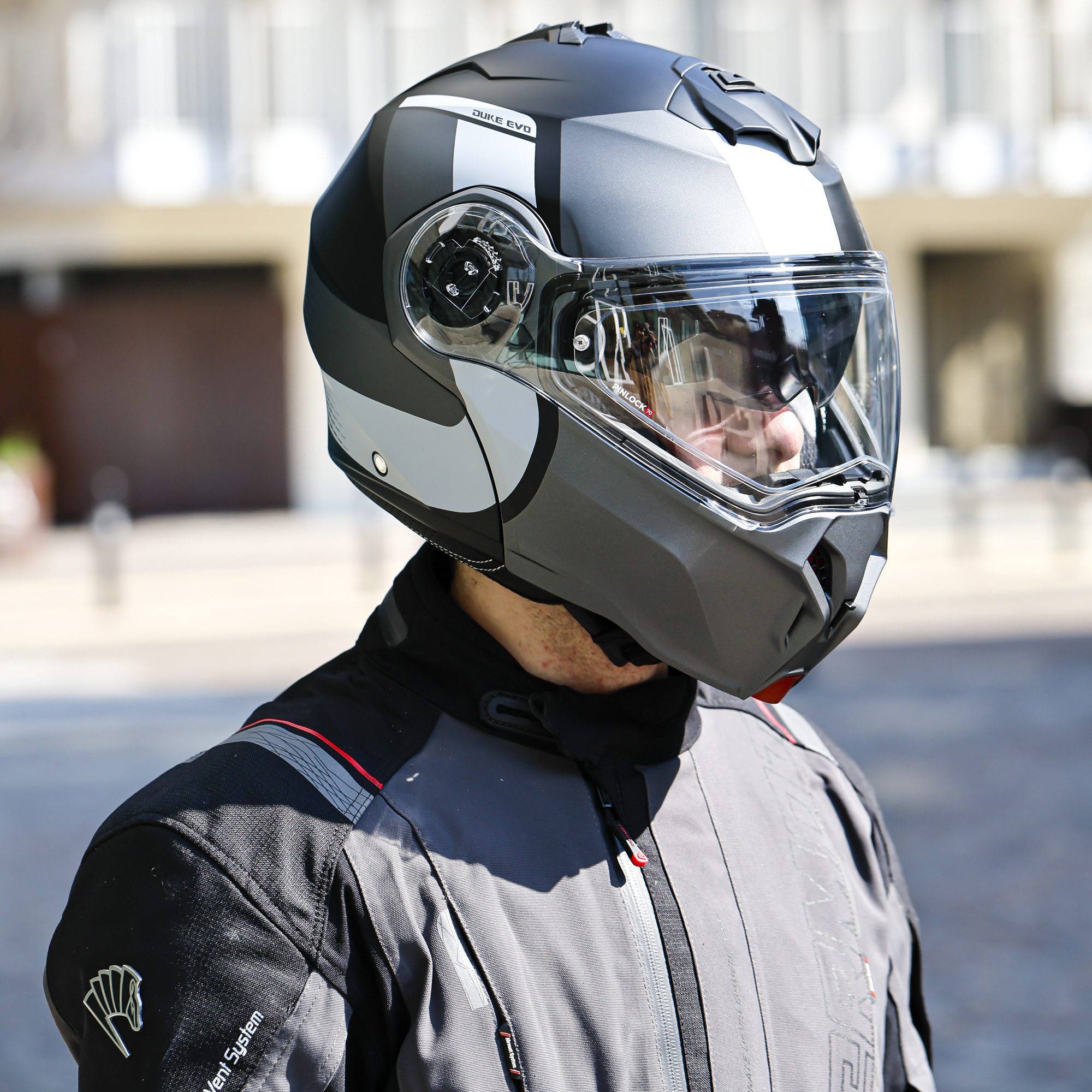 The Caberg Duke Evo flip up motorcycle helmet is a superb choice for riders looking to tackle the road in safety and comfort. Innovative technical solutions and a captivating look ensure that your ride is pleasurable everyday of the year, no matter the weather.