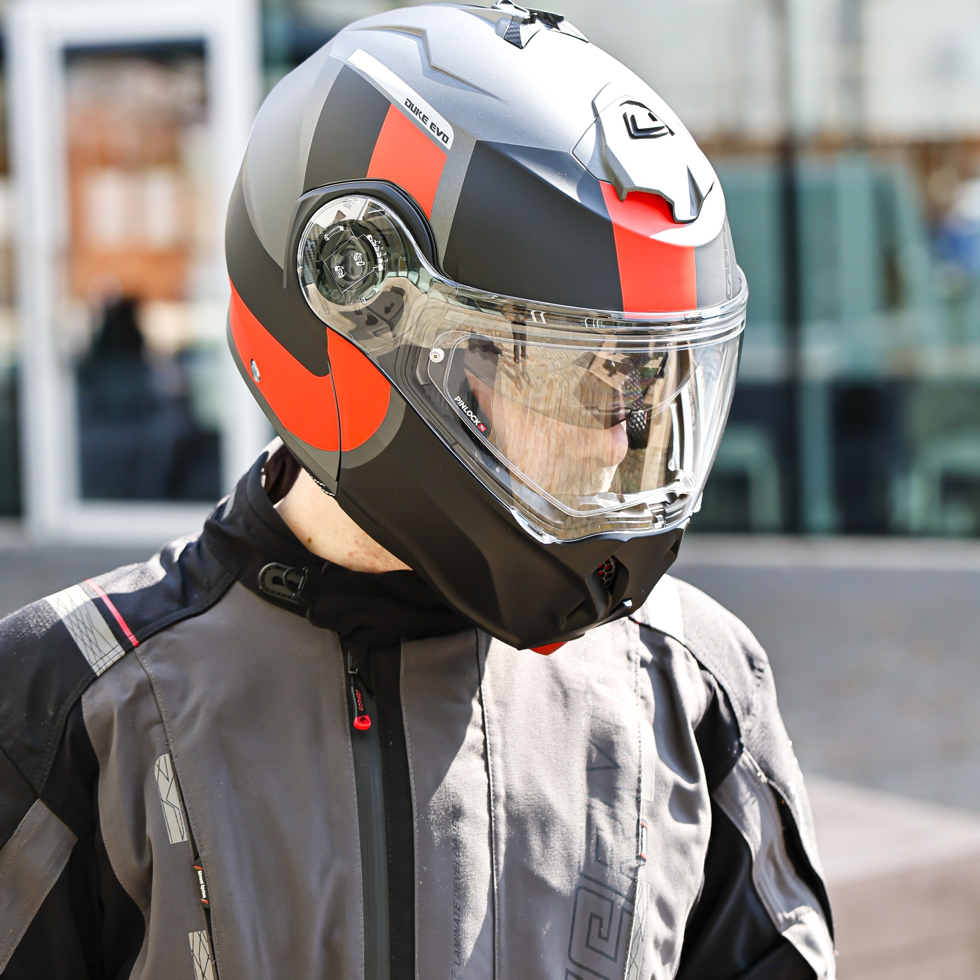 The Caberg Duke Evo flip up motorcycle helmet is a superb choice for riders looking to tackle the road in safety and comfort. Innovative technical solutions and a captivating look ensure that your ride is pleasurable everyday of the year, no matter the weather.