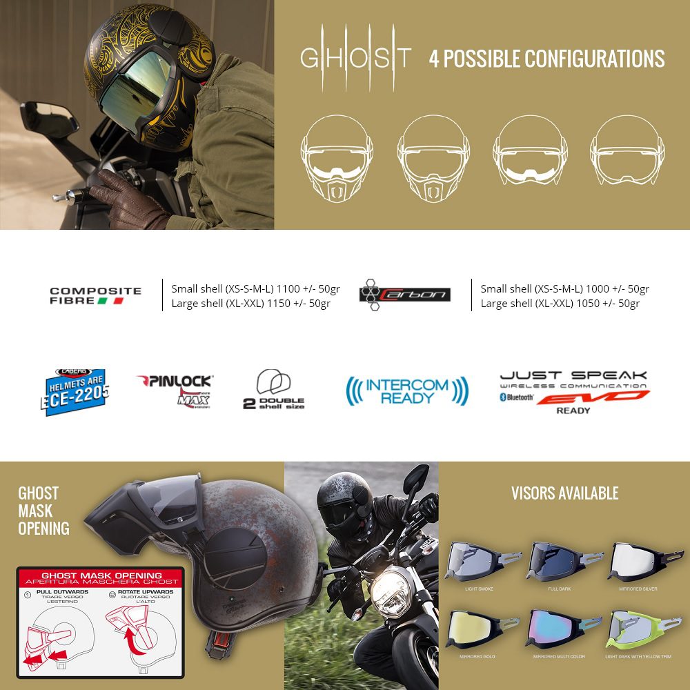 The Caberg Ghost X plain motorcycle helmet is an open face helmet with a captivating and bold design and unique functionality. Equipped with a goggle-shaped anti-scratch and anti-fog visor and protective mask, it offers four configurations. The outer shell is made of fiber glass and is available in three shell sizes with fully removable and washable interiors to keep your helmet feeling fresh long after it’s first journey. Compatible with the Caberg Pro Speak Evo Bluetooth kit and other universal Bluetooth intercoms.