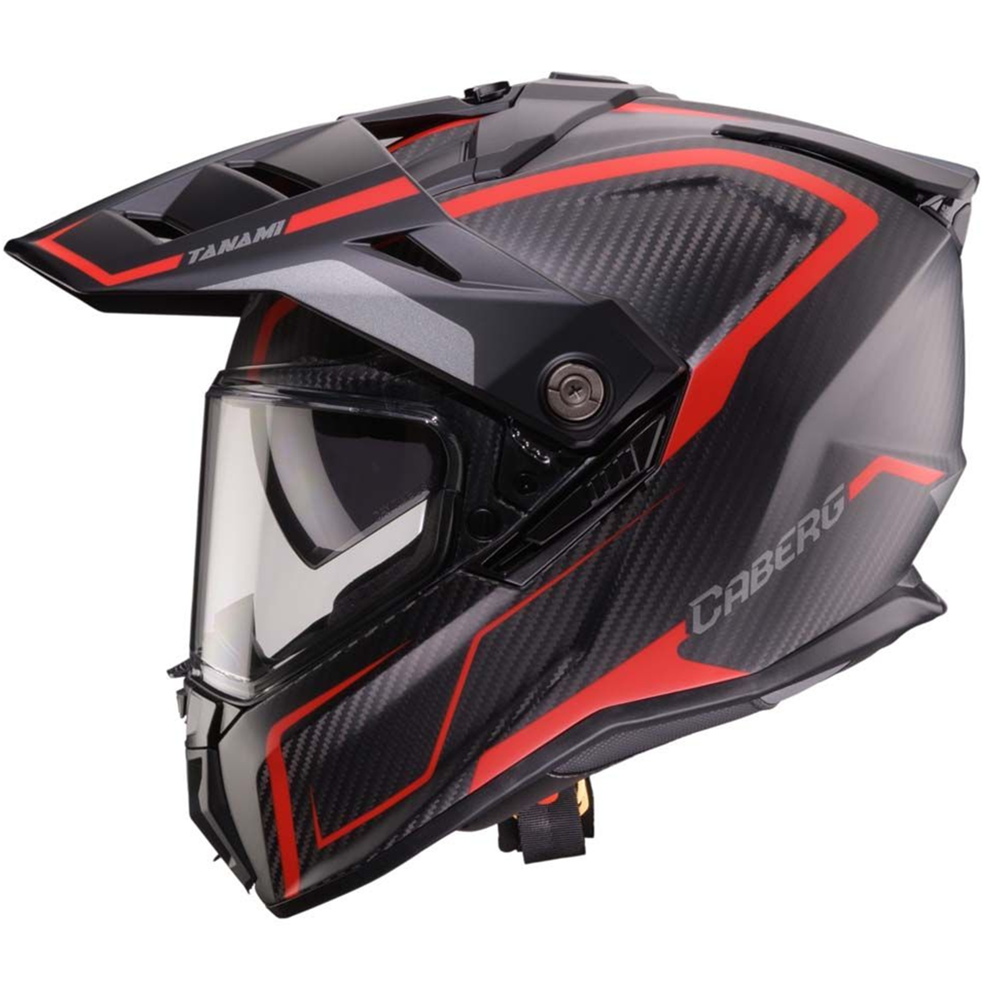 The Caberg Tanami Carbon Gravity Motorcycle helmet is a full-face on-off road helmet, available in two shell sizes made of carbon fiber and fiber glass. An innovative ventilation system with quick release magnets that allows to convert the helmet from on to off-road and vice versa in a few seconds.
