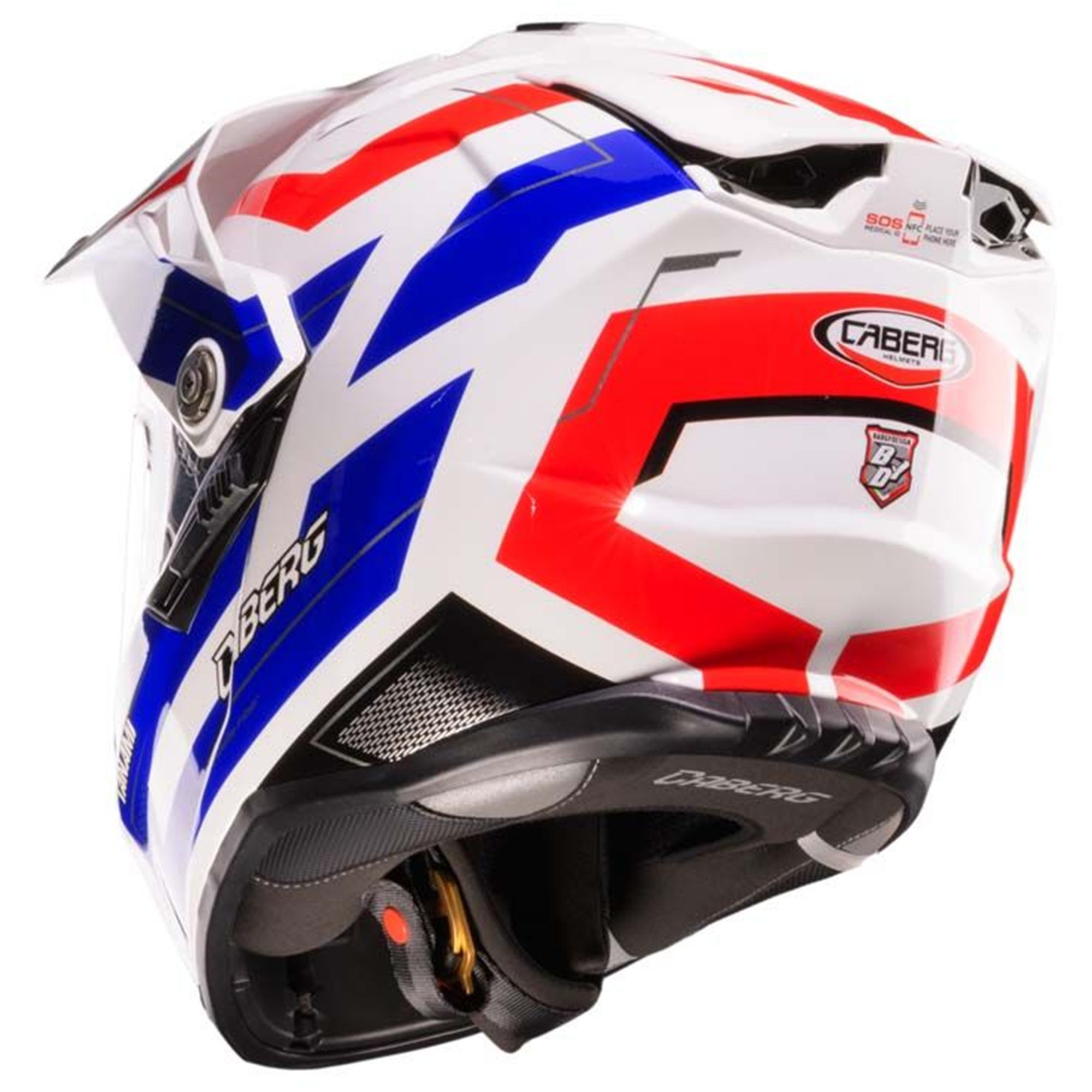 The Caberg Tanami Ranger motorcycle helmet is Caberg’s flagship adventure motorbike helmet, constructed with fibreglass and available in two shell sizes for optimal comfort. An innovative ventilation system with quick release magnets allows you to effortlessly convert the riding helmet from an on-road to off-road set-up and vice versa in mere few seconds. Moreover itโs possible to mount a hydration tube inside the chin guard for those of us planning to ride all day long! Equipped with the Caberg SOS medical ID technology, the dual sport motorcycle helmet offers comfort and safety for every adventure.