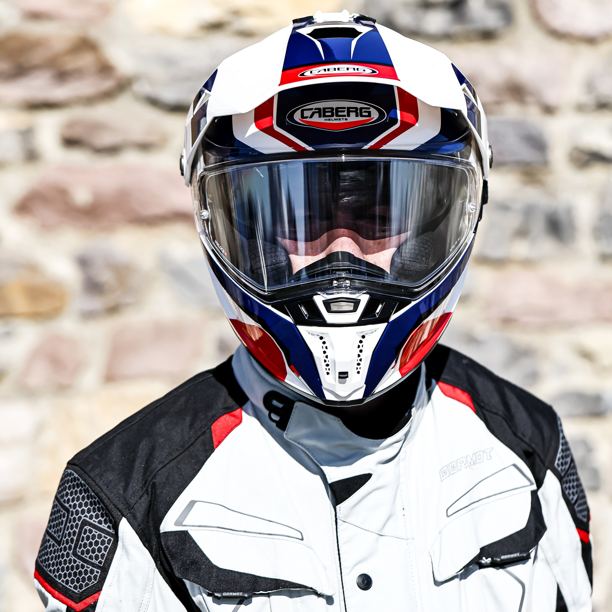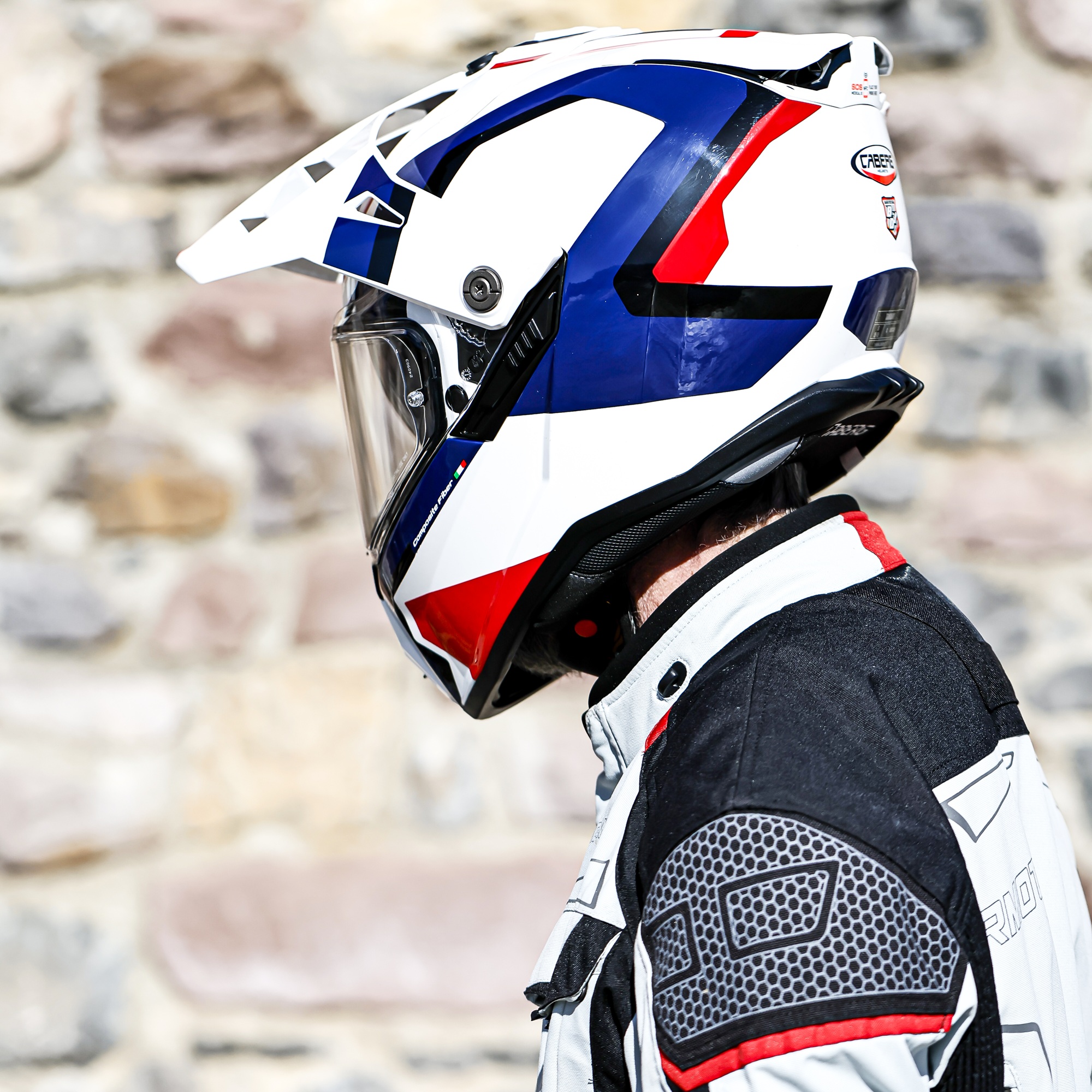 The Caberg Tanami Scram motorcycle helmet is Caberg’s flagship adventure motorbike helmet, constructed with fibreglass and available in two shell sizes for optimal comfort. An innovative ventilation system with quick release magnets allows you to effortlessly convert the riding helmet from an on-road to off-road set-up and vice versa in mere few seconds. Moreover it’s possible to mount a hydration tube inside the chin guard for those of us planning to ride all day long! Equipped with the Caberg SOS medical ID technology, the dual sport motorcycle helmet offers comfort and safety for every adventure.