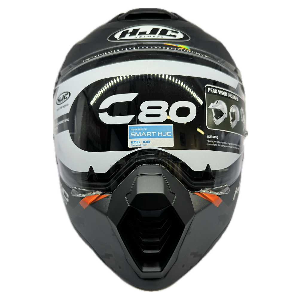 The HJC C80 Bult dual sport motorcycle helmet brings a new look to the HJC line-up. Designed to be used while riding off-road or on the street, the flip up motorbike helmet allows the rider to have multiple configurations to suit your riding needs. Constructed using HJC’s advanced Polycarbonate composite shell, the result is a lightweight helmet, which also delivers a superior fit and comfort from advanced CAD technology. The C80 offers a wide vision outer visor and easy to use internal sun shield, proving optimal vision. The helmet can be ridden with or without the extended peaked visor, allowing you to tackle the road without drag at high speeds. The modular chin bar uses a one-touch and easy to use lever that is glove-friendly. Smart HJC ready to accept the 10B or 20B Bluetooth systems (sold separately).