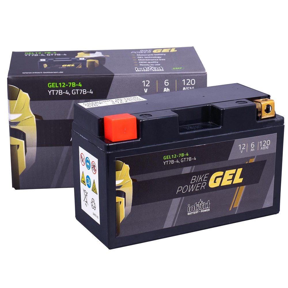 The Intact IT7B-4 Gel Motorcycle Battery is a fully sealed GEL battery, which is factory activated, supplied pre-charged and require no acid-filling to get started. A premium ready-to-use high performance battery, the GEL motorbike battery offers greater charge-cycle performance over AGM and SLA batteries of same case size.