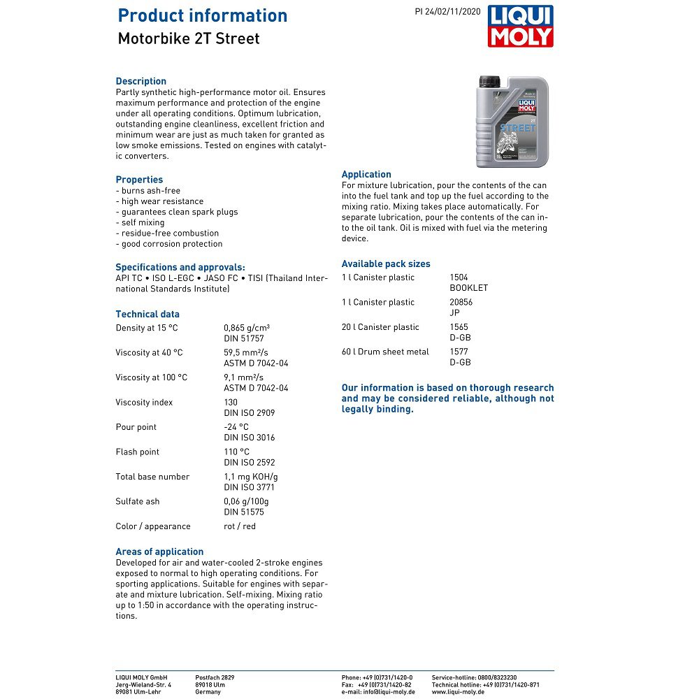 The Liqui Moly engine oil has been developed for air and water-cooled 2-stroke engines exposed to normal to high operating conditions and for sporting applications. Suitable for engines with separate and mixture lubrication. Self-mixing. Mixing ratio up to 1:50 in accordance with the operating instructions.