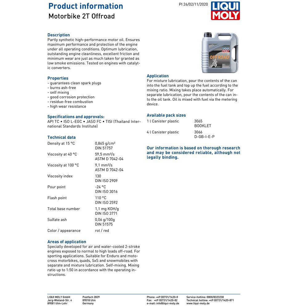 The Liqui Moly 2 Stroke Off Road Semi Synthetic Oil is a partly synthetic high-performance motor oil perfect for adventure, motocross and off road enthusiasts. Ensures maximum performance and protection of the engine under all operating conditions.