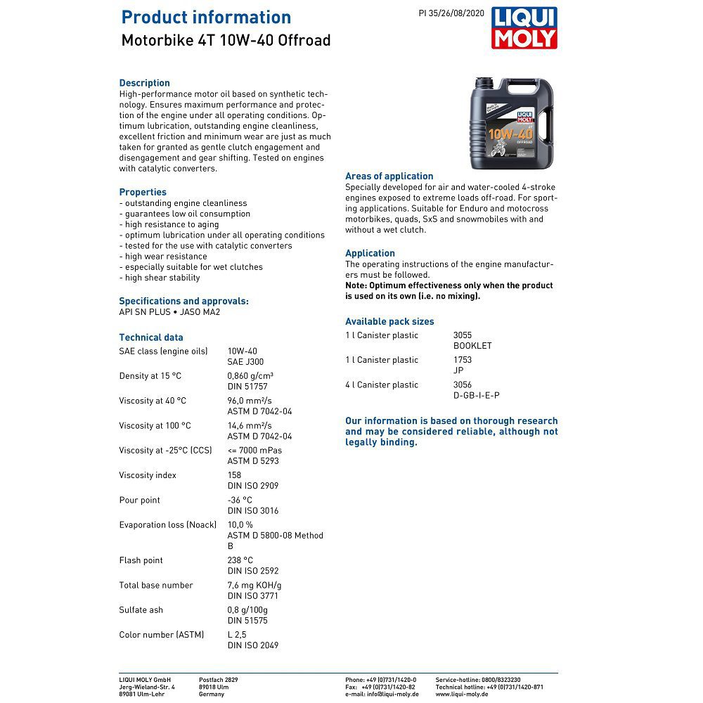 The Liqui Moly off-road motor oil has been specially developed for air and water-cooled 4-stroke engines exposed to extreme loads off-road. For sporting applications. Suitable for Enduro and motocross motorbikes, quads, SxS and snowmobiles with and without a wet clutch.