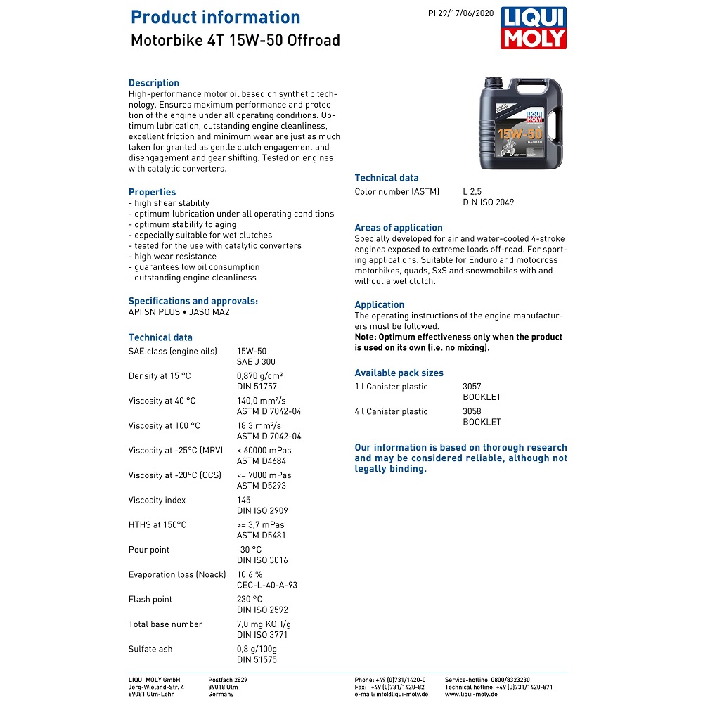 The Liqui Moly Off-Road engine oil has been specially developed for air and water-cooled 4-stroke engines exposed to extreme loads off-road. For sporting applications. Suitable for Enduro and motocross motorbikes, quads, SxS and snowmobiles with and without a wet clutch.