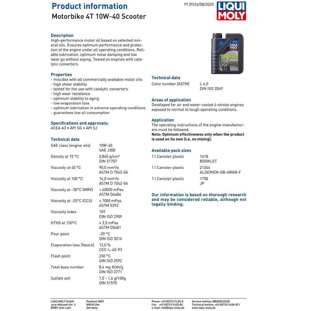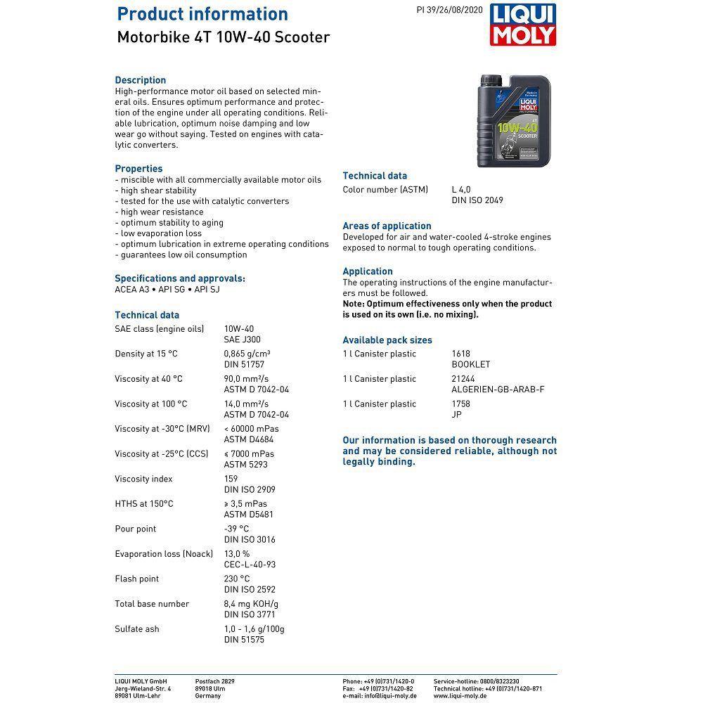 The Liqui Moly 4 Stroke Scooter 10W-40 Mineral Oil is a high-performance motor oil based on selected mineral oils, perfect for everyday riders. Ensures optimum performance and protection of the engine under all operating conditions. Reliable lubrication, optimum noise damping and low wear goes without saying. Tested on engines with catalytic converters.