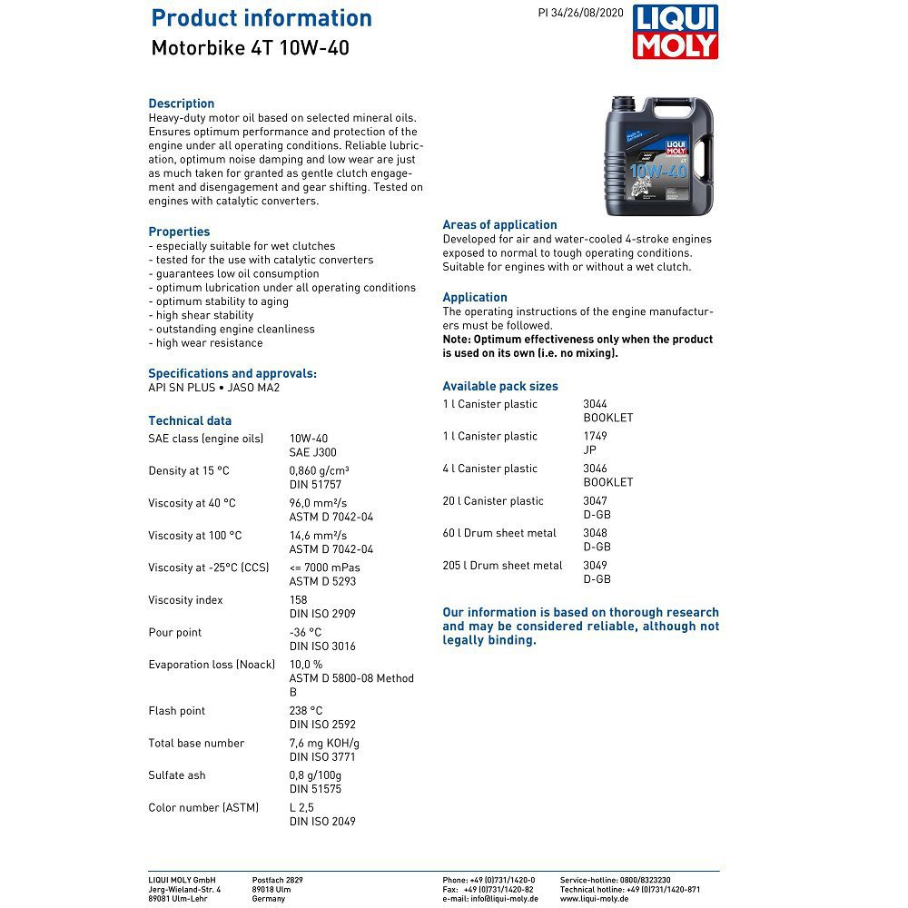 The Liqui Moly motorcycle oil has been developed for air and water-cooled 4-stroke engines exposed to normal to tough operating conditions. Suitable for engines with or without a wet clutch.