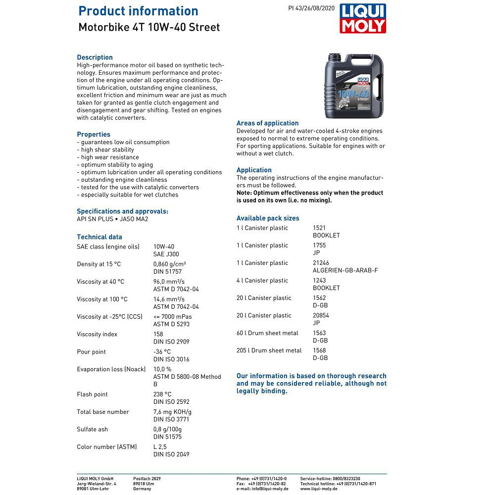 The Liqui Moly motorcycle engine oil has been developed for air and water-cooled 4-stroke engines exposed to normal to extreme operating conditions. For sporting applications. Suitable for engines with or without a wet clutch.