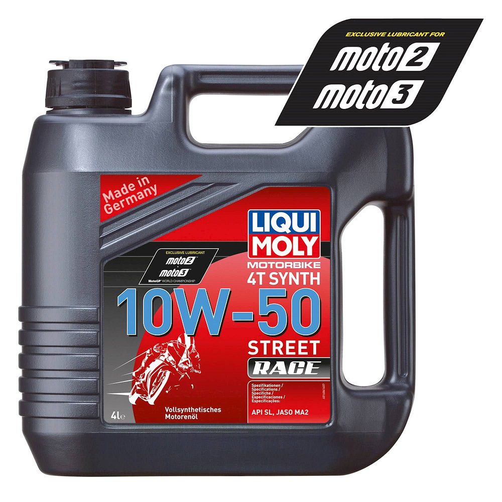 The Liqui Moly 4 Stroke Street 10W-50 Fully Synthetic Race Oil is a high-performance motor oil, perfect for enthusiasts. Ensures maximum performance and protection of the engine under all operating conditions. Optimum lubrication, outstanding engine cleanliness, excellent friction and minimum wear are just as much taken for granted as gentle clutch engagement, disengagement and gear shifting. That makes a big difference to driving enjoyment! Tested on engines with catalytic converters & on racing machines.