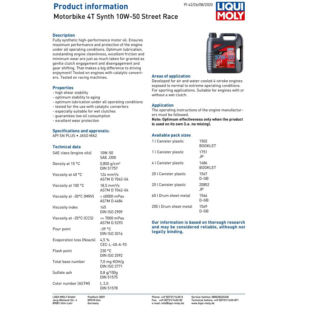 The Liqui Moly motorcycle engine oil has been specially developed for air and water-cooled 4-stroke engines exposed to normal to extreme operating conditions. For sporting applications. Suitable for engines with or without a wet clutch.