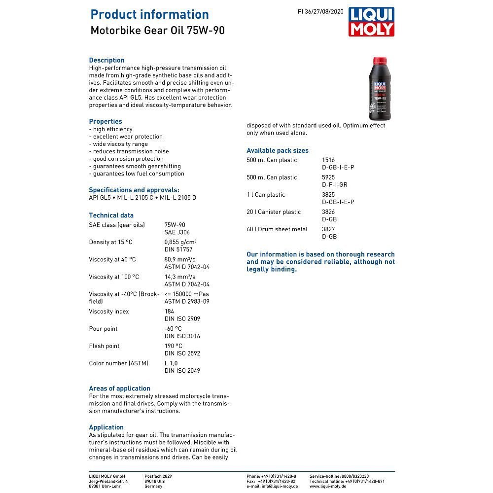 The Liqui Moly 75W-90 fully synthetic motorcycle gear oil is a high-Performance & high-pressure motorbike gear oil, made from high-grade synthetic base oils and additives. Facilitates smooth and precise shifting even under extreme conditions and complies with performance class API GL5. Has excellent wear protection properties and ideal viscosity-temperature behavior. For the most extremely stressed motorcycle transmission and final drives. Comply with the transmission manufacturer’s instructions.