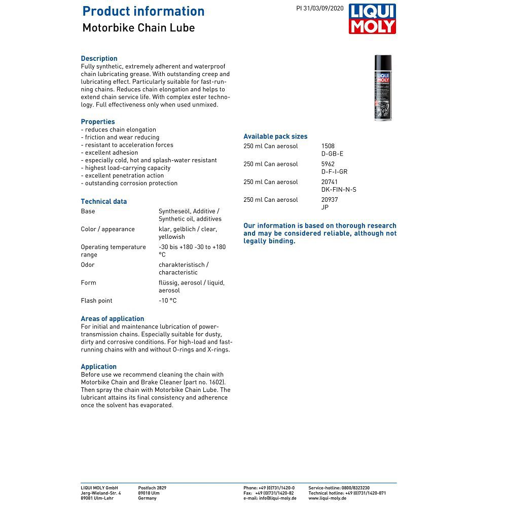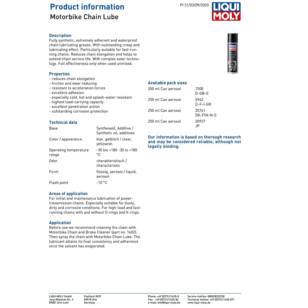 The Liqui Moly motorcycle chain lube is a fully synthetic chain lubricating grease. The formula is extremely adherent and waterproof, and provides excellent penetration ability and lubrication. Particularly suitable for fast-running chains.