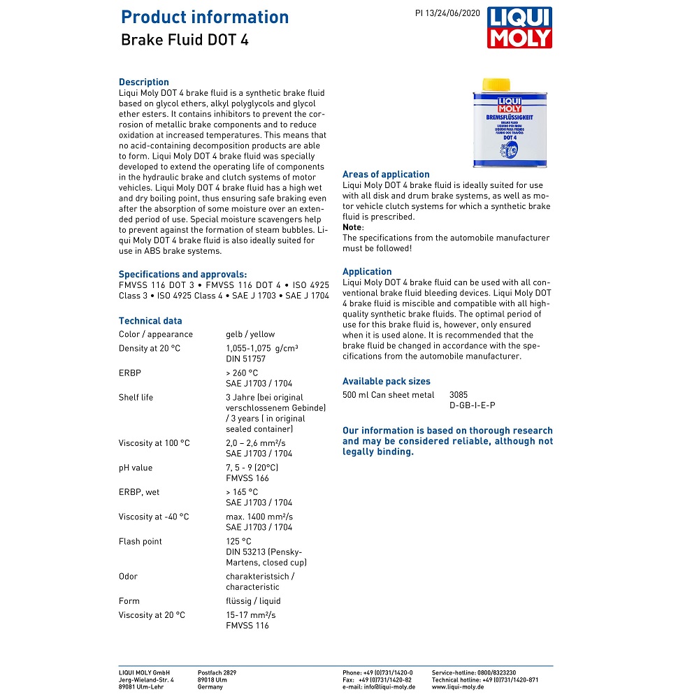 Liqui Moly Dot 4 motorcycle brake fluid tin is a great choice for riders after consistent and smooth operation of their brakes. Exceptionally well-suited for use with all disk and drum brake systems, as well as vehicle clutch systems for which a synthetic brake fluid of this specification is prescribed.