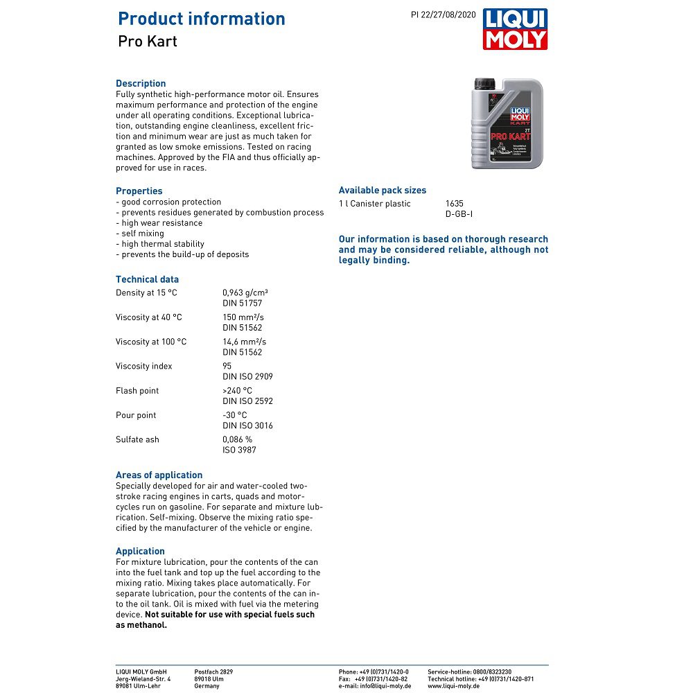 The Liqui Moly go-kart oil is specially developed for air and water-cooled two stroke racing engines in carts, quads and motorcycles run on gasoline. For separate and mixture lubrication. Self-mixing. Observe the mixing ratio specified by the manufacturer of the vehicle or engine.