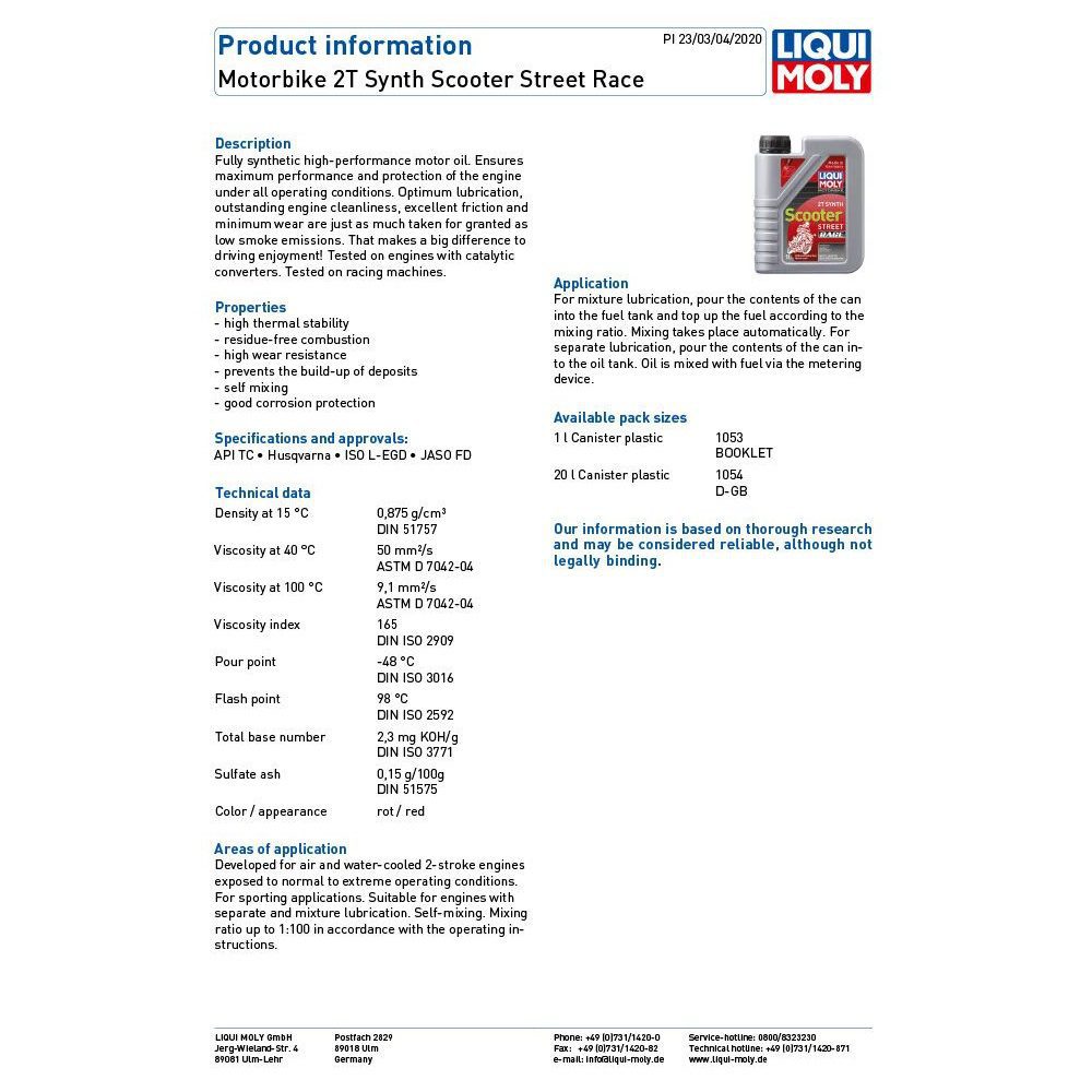 The Liqui Moly 2 Stroke Scooter Fully synthetic race oil is a high-performance motor oil perfect for racers and enthusiasts. Ensures maximum performance and protection of the engine under all operating conditions. Optimum lubrication, outstanding engine cleanliness, excellent friction and minimum wear are just as much taken for granted as low smoke emissions. That makes a big difference to driving enjoyment! Tested on engines with catalytic converters. Tested on racing machines.