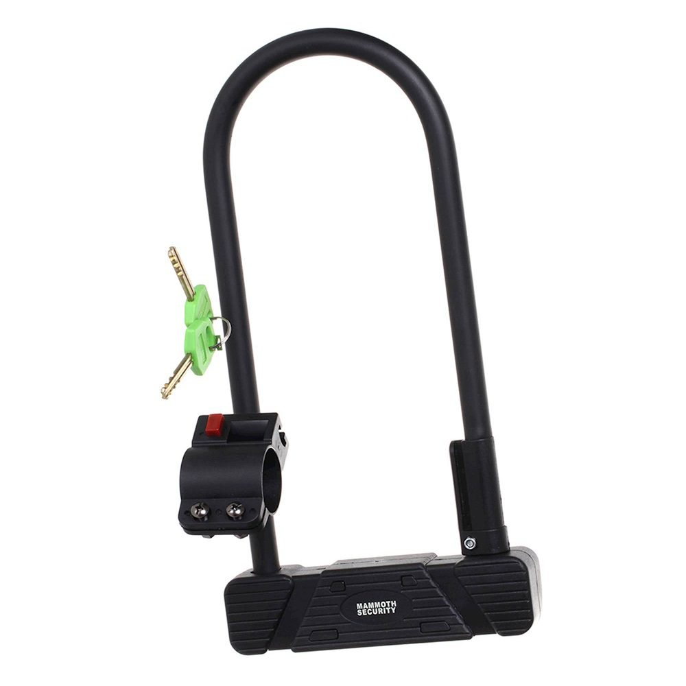 The Mammoth black motorcycle shackle u-lock is perfect for riders looking to keep their ride safe & secure. A hardened steel shackle can withstand some serious punishment, while the locks design allows general use alongside motorcycle security.