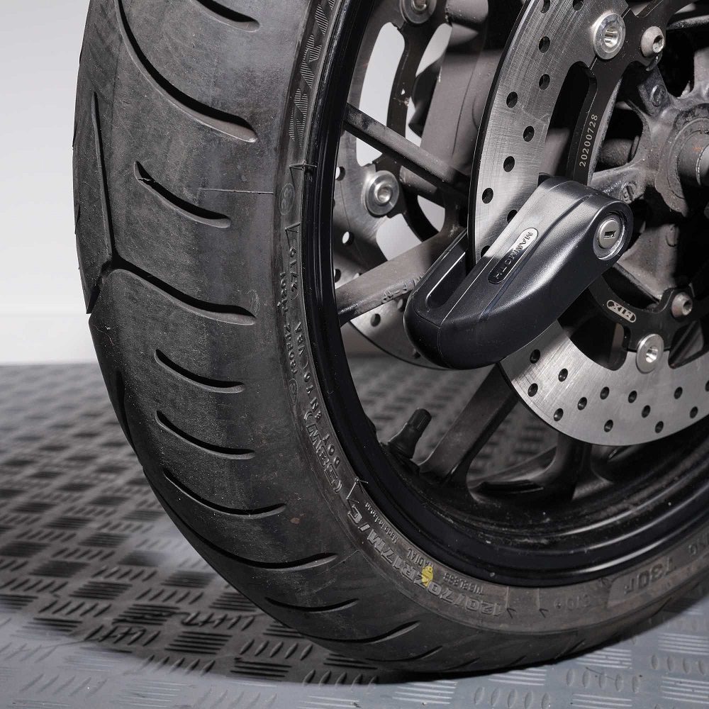The Mammoth rogue motorcycle disc lock 10mm lock will keep your motorbike or scooter protected and deter and thieves! Simply attach this to your front disc brake, suitable for 10mm size pins.