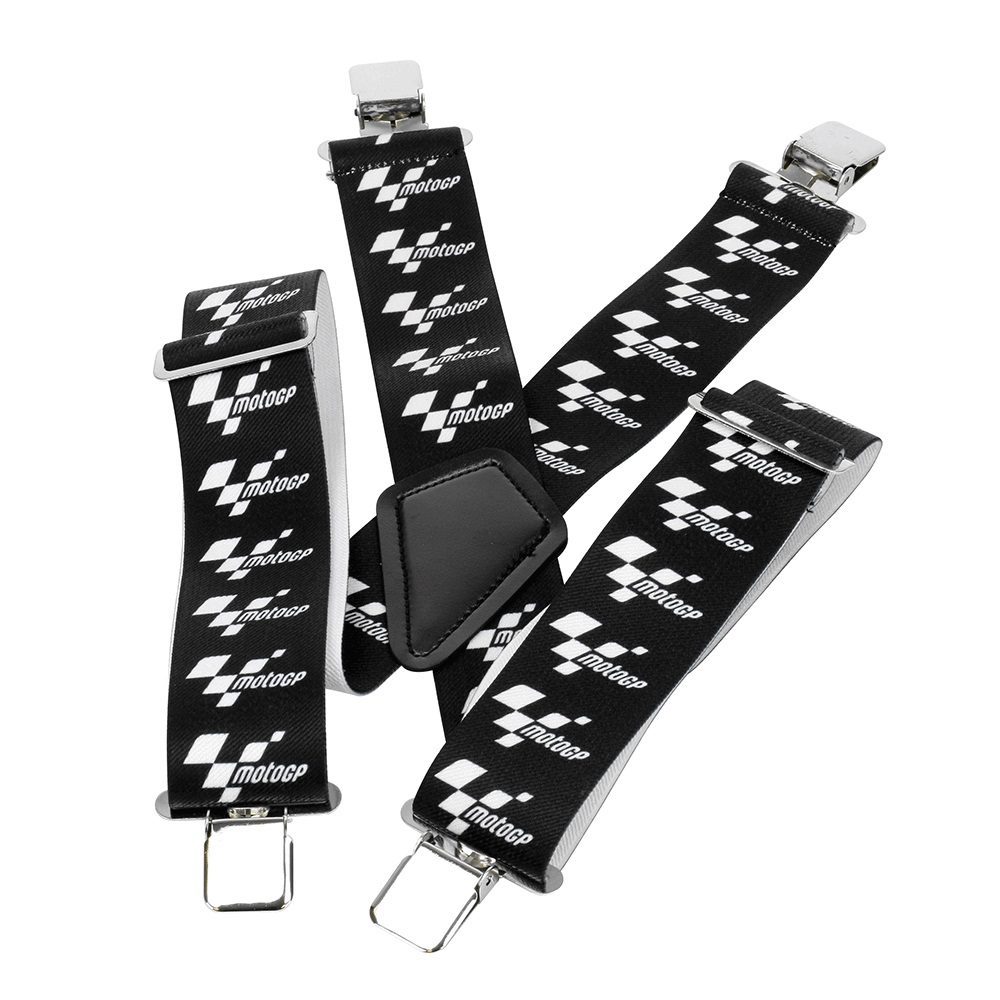 The MotoGP Braces are a stylish solution to keeping your clothing in shape while out on your bike. Elasticated, and fully adjustable for all rider heights. Over-sized waist clamps ensure that your trousers stay up, and are suitable for use with jeans, textile trousers and leathers.