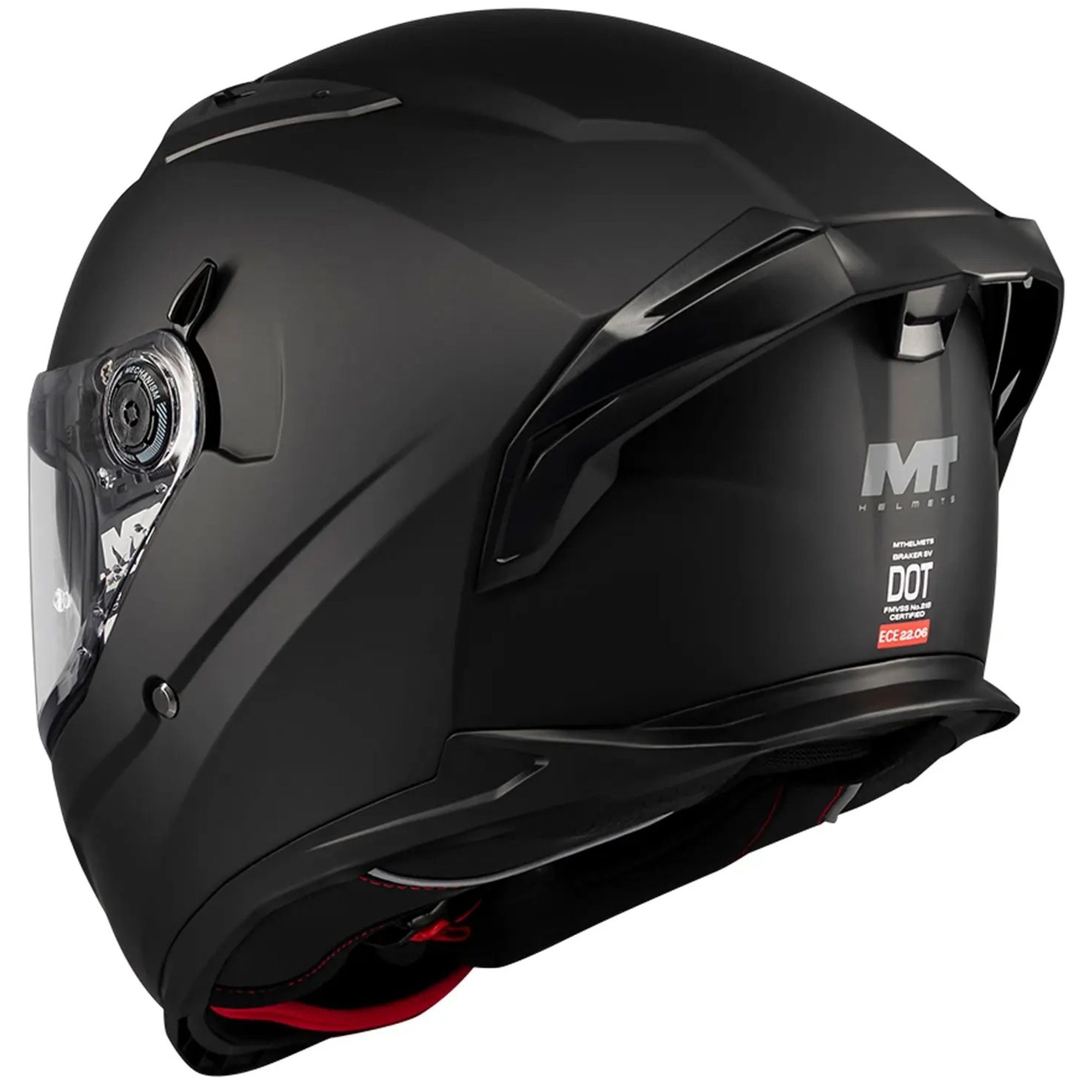 The MT Braker is a next-generation motorbike helmet model designed to meet ECE 22.06 standards from its inception, ensuring the highest level of safety at an affordable price point. It boasts a triple front ventilation system and a removable rear spoiler with an air extraction system to enhance interior airflow.