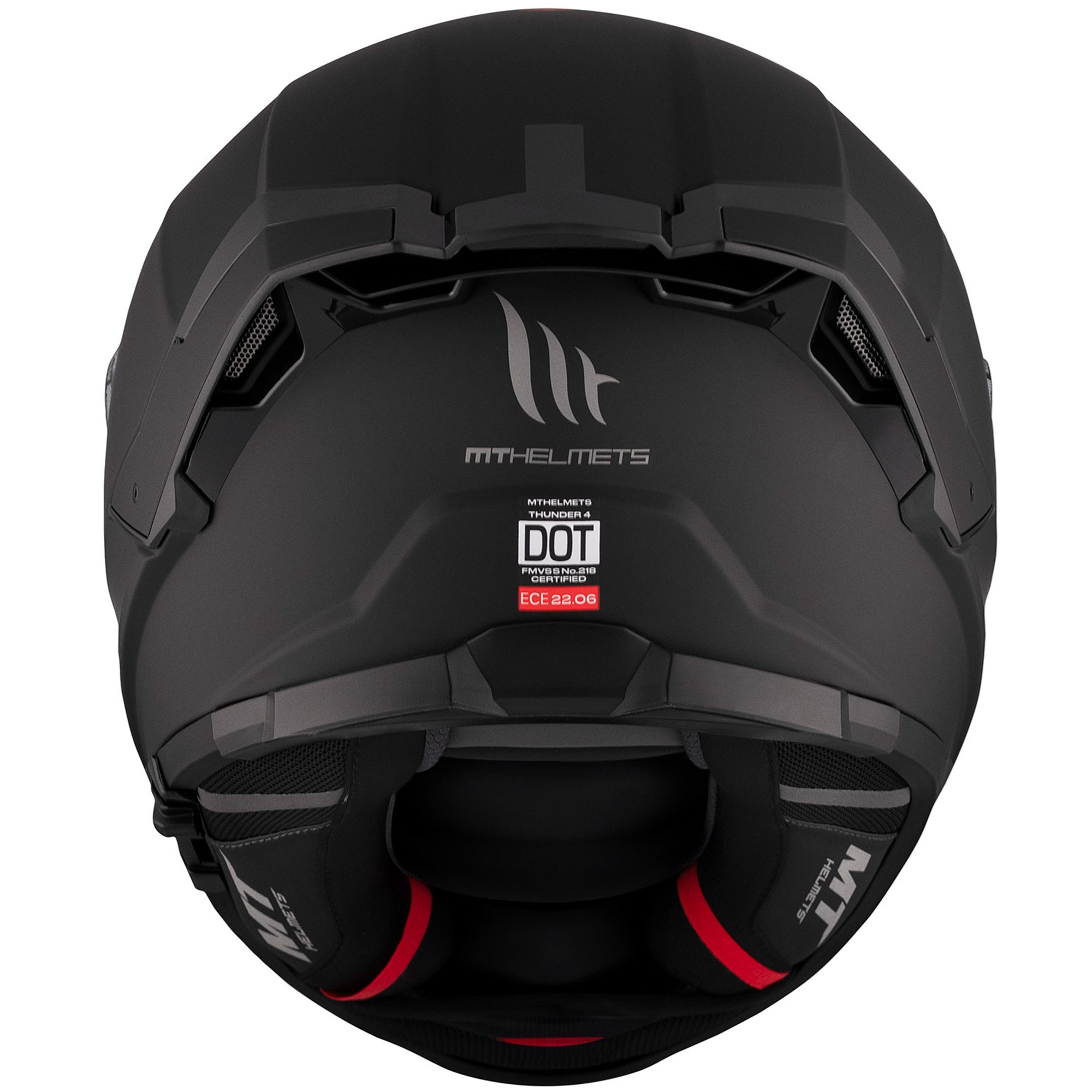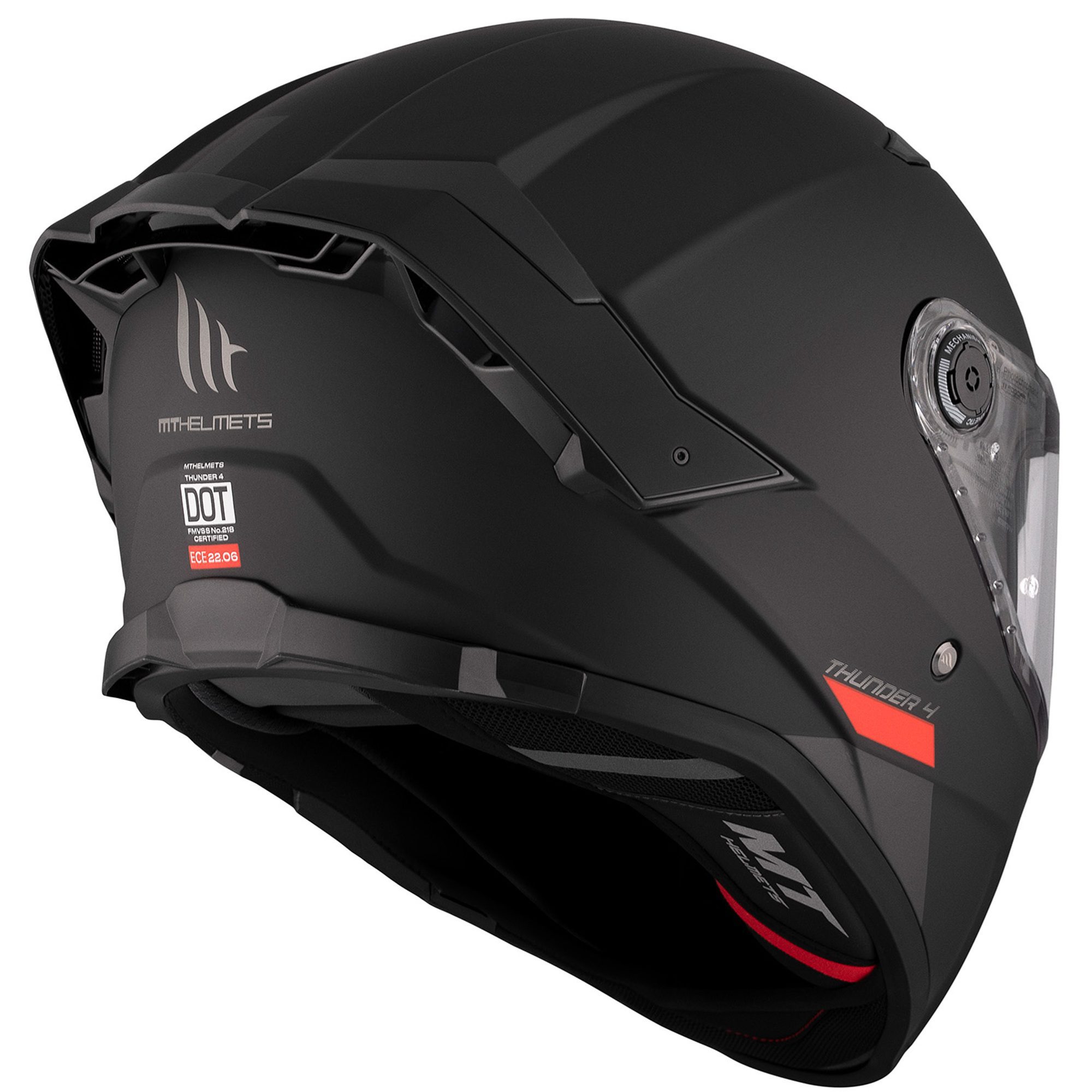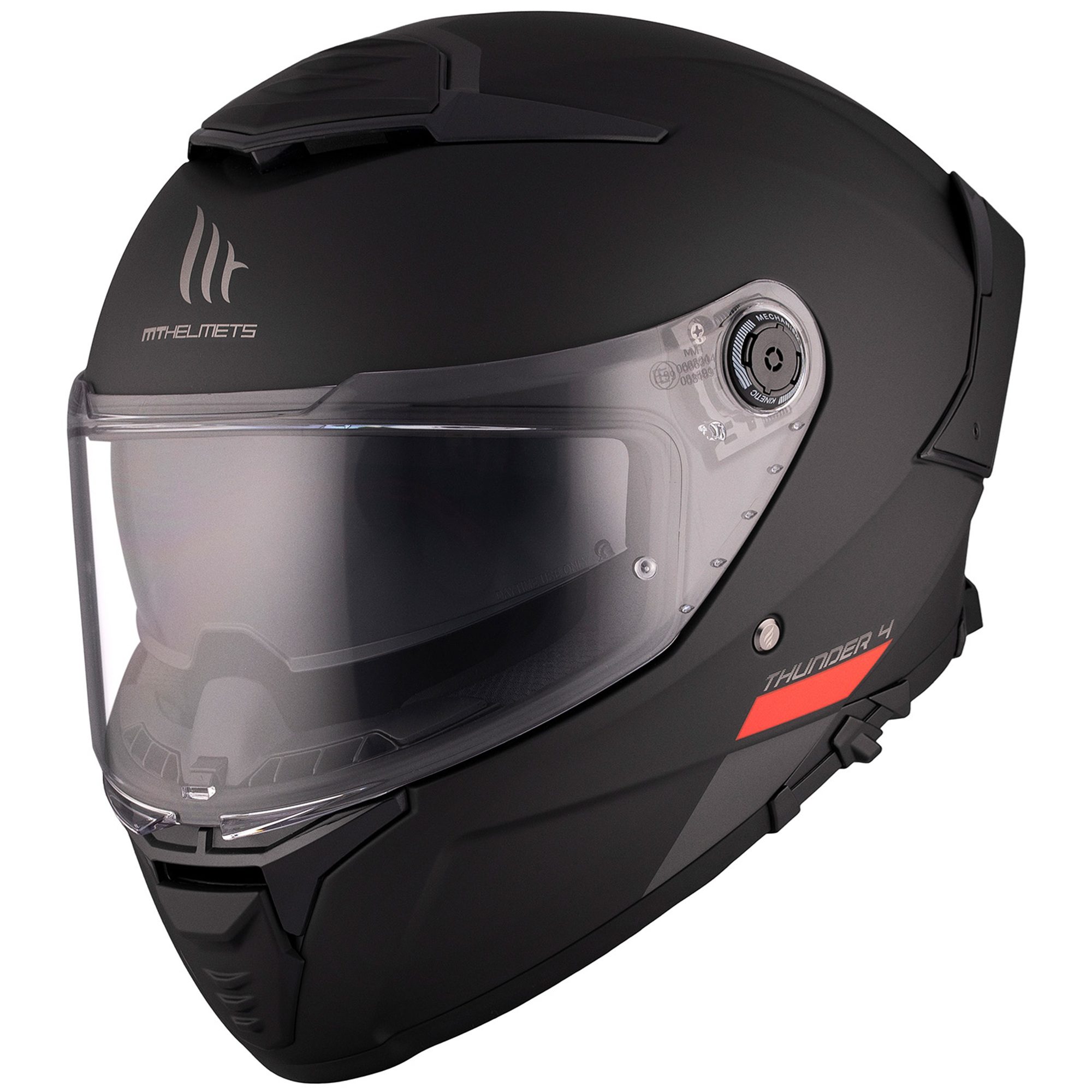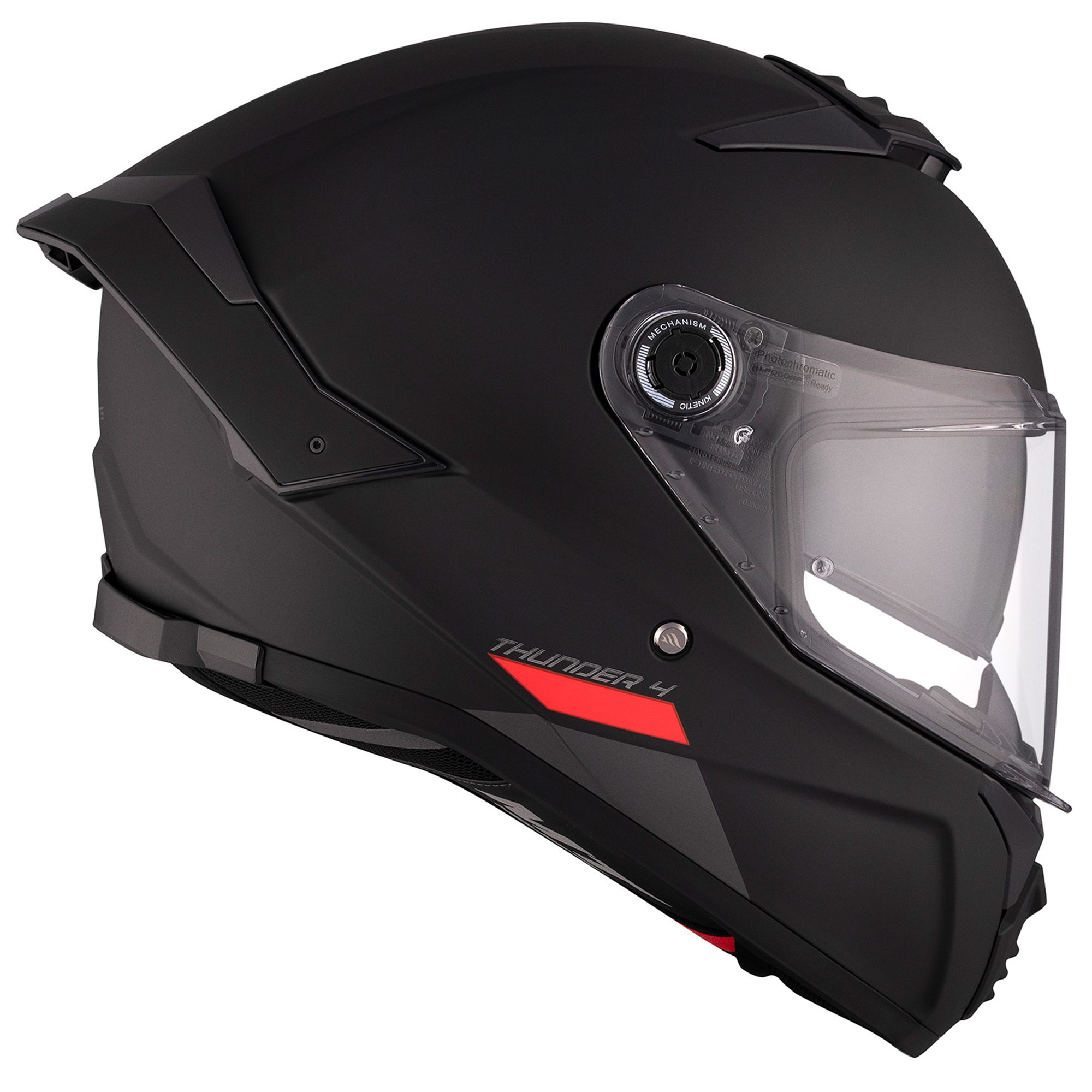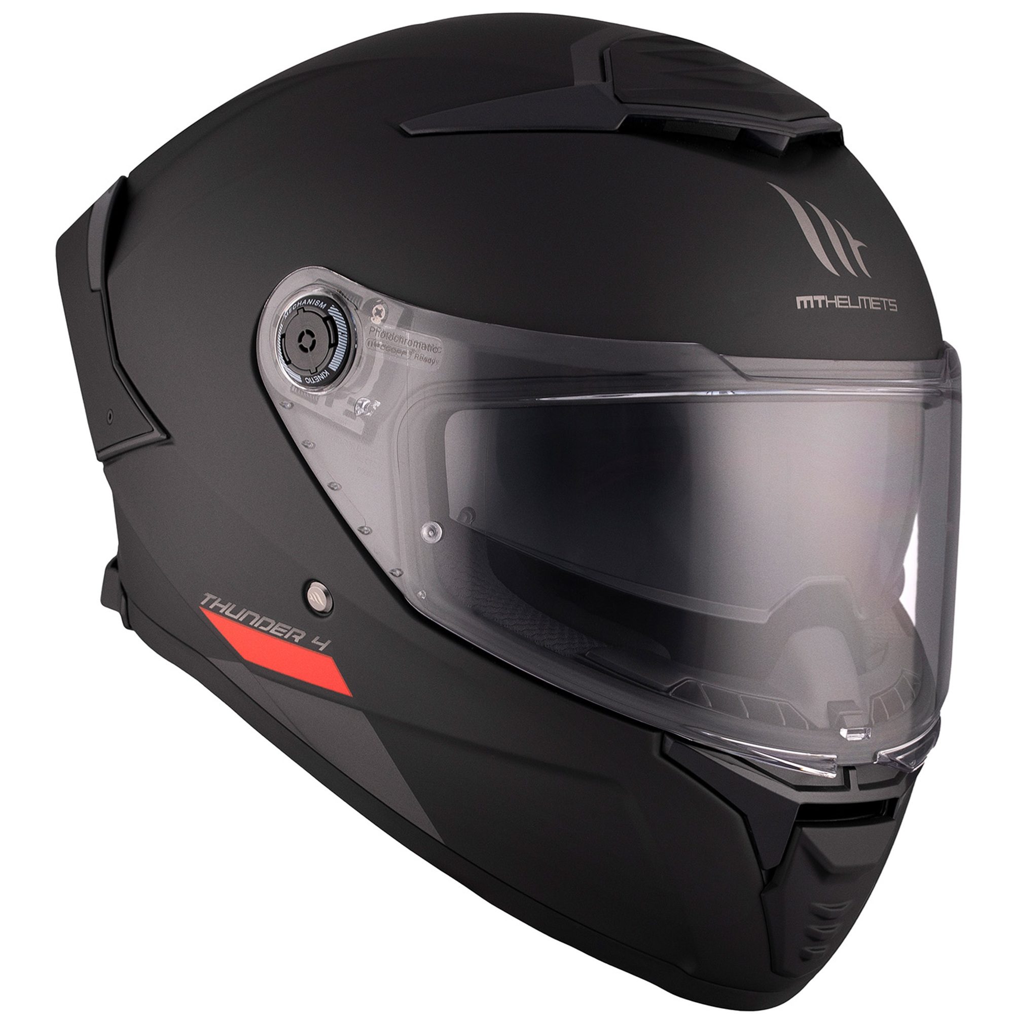 The MT Thunder 4 plain motorcycle helmet is the top of the range sport-touring full face motorbike helmet from MT, known for its exceptional value for money. Designed for long distances, it provides superior ergonomics and a wide field of vision. Its ventilation system has been optimised through fluid dynamics studies, and ensures efficient airflow.