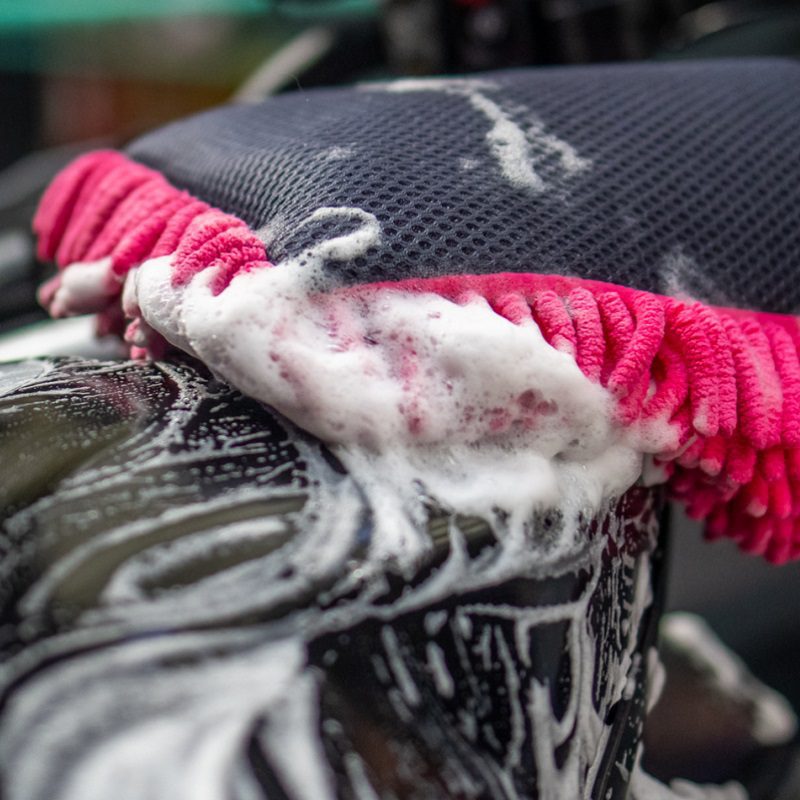 Then use the microfibre mitt side to gett scrubbing! Safe to use all-over your bike.