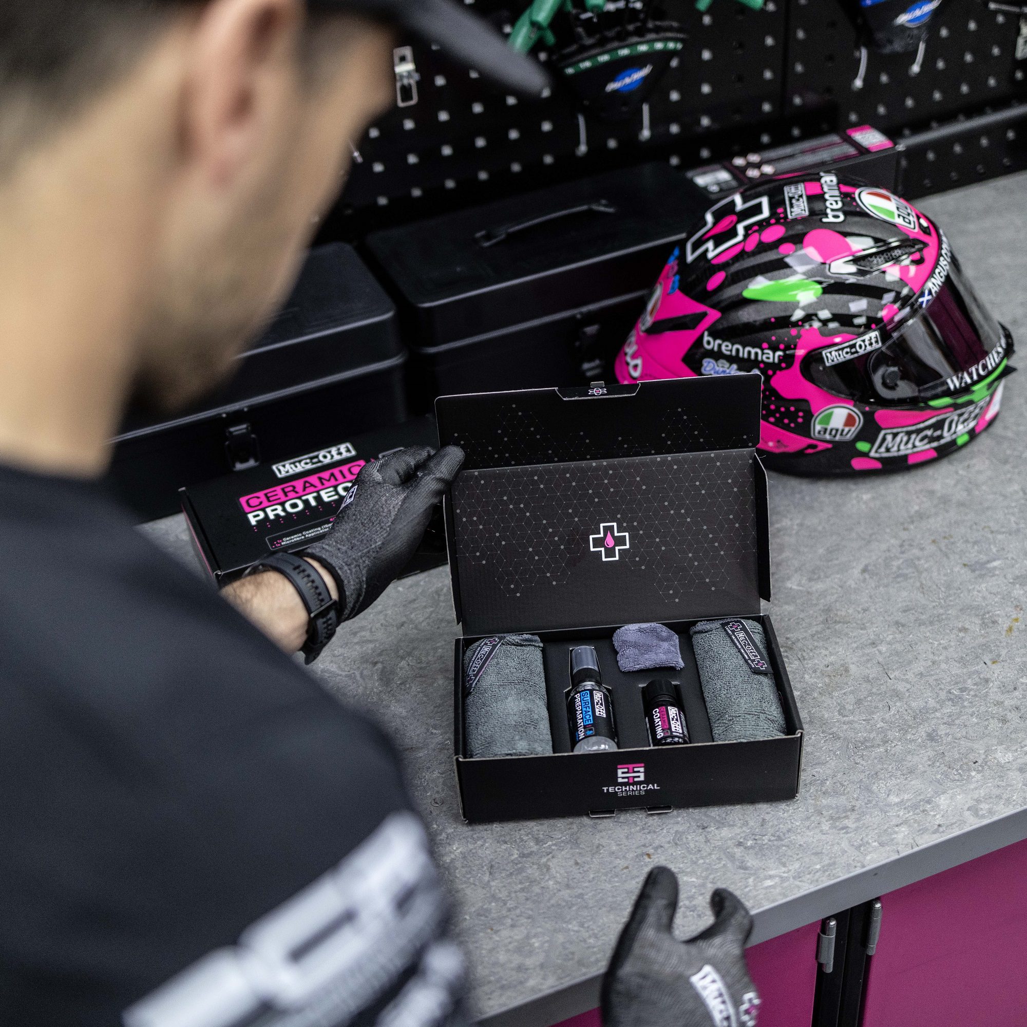 The Muc-Off Ceramic motorcycle protection kit allows you to coat your motorbike in a highly advanced & durable silicon-infused protective layer, that chemically bonds to your paintwork, producing a high-performance hydrophobic layer for maximum water and dirt shedding properties. It’s designed to keep your bike cleaner for longer, and much easier to clean and maintain.
