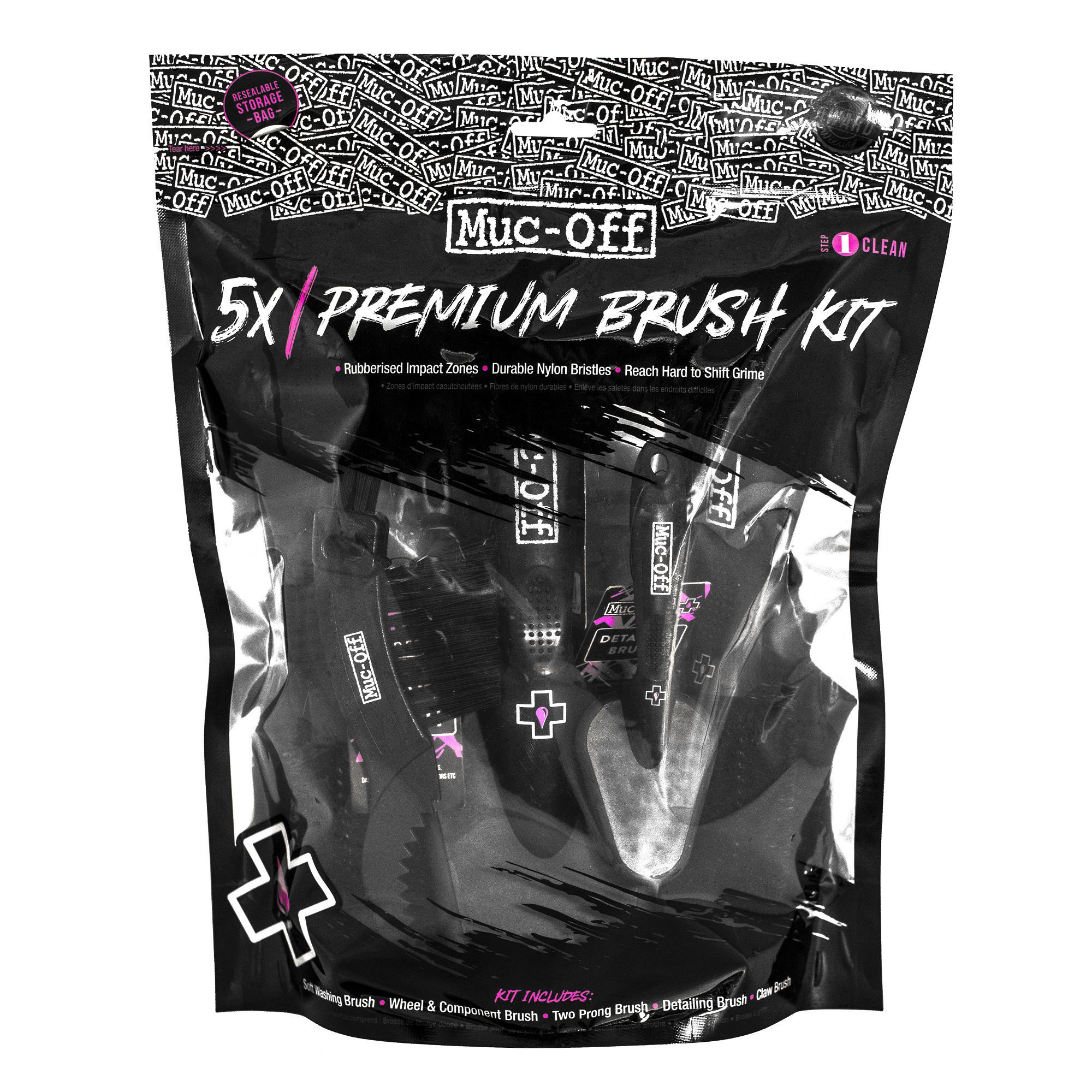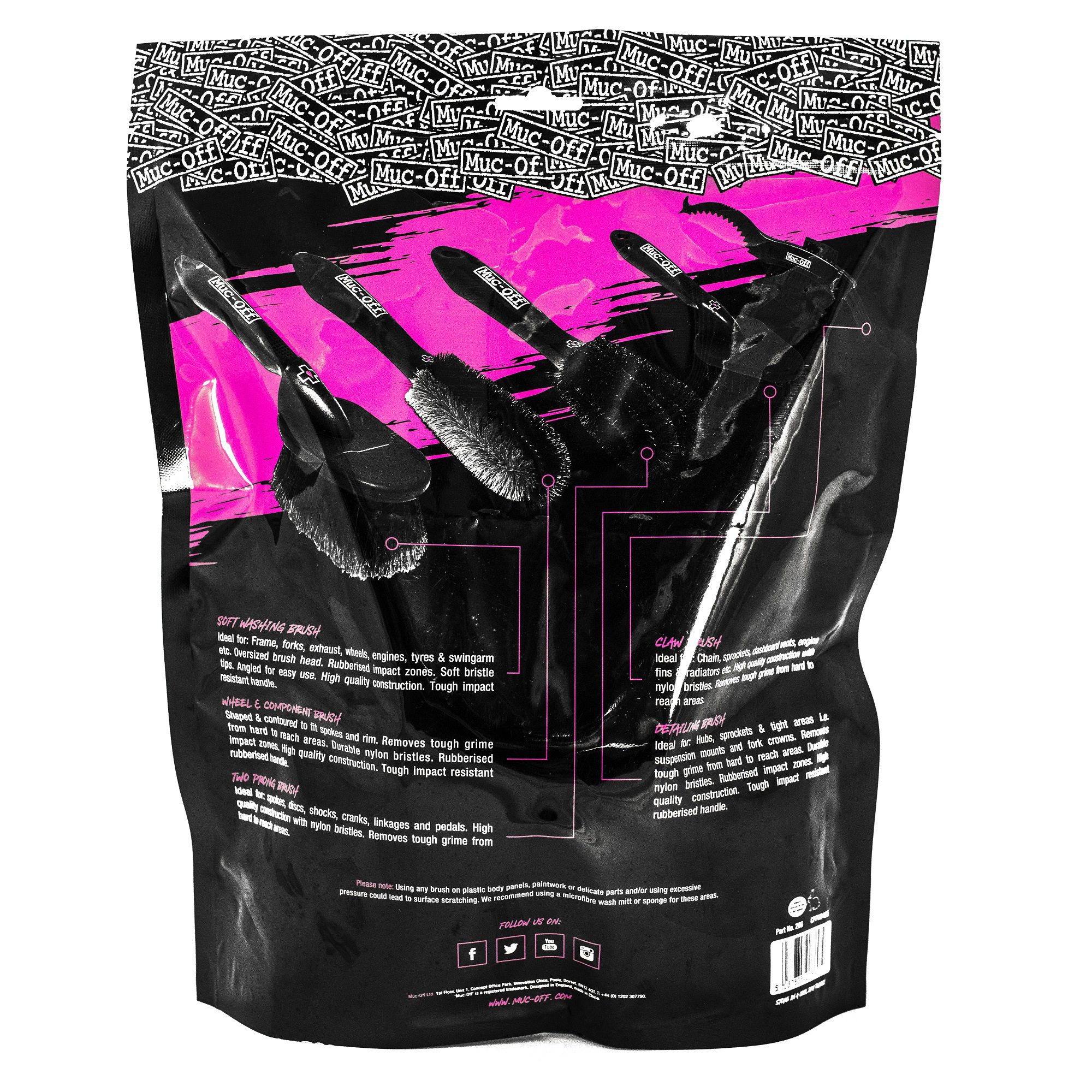 Muc-Off Claw Brush: High quality construction with triple brush heads featuring tough nylon bristles and an integral scraper for mud de-clogging. Ideal for sprockets, drive trains and engine fins.