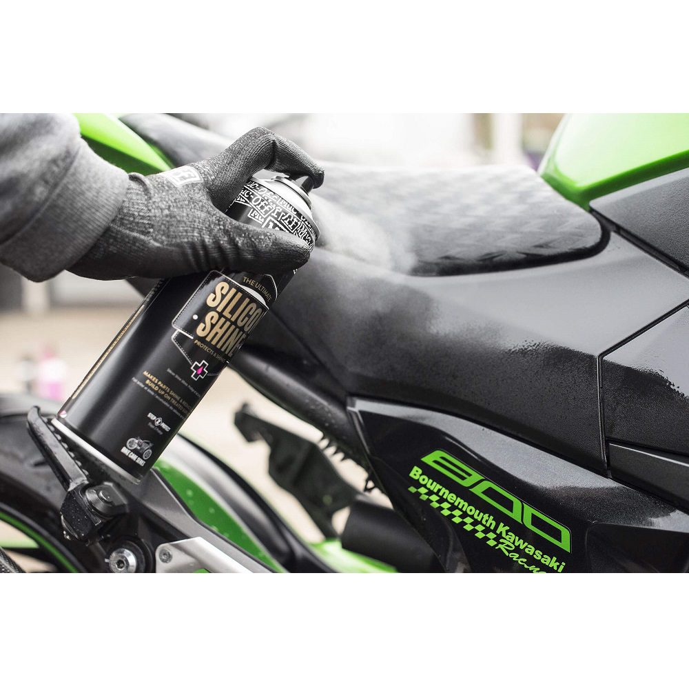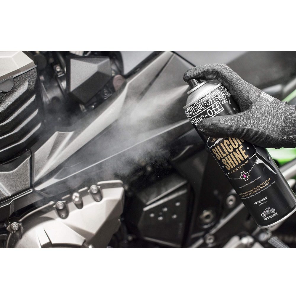 Apply the finishing touch to your motorbike today. The Muc-Off Silicon Shine not only leaves your motorcycle looking factory fresh, but it also acts as an amazing friction reducer for suspension parts and reduces dirt adhesion.