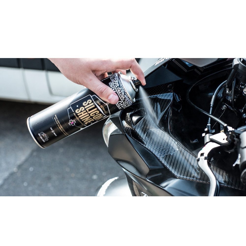 Muc-Off Silicone Shine not only leaves your motorcycle looking factory fresh, but it also acts as an amazing friction reducer for suspension parts and reduces dirt adhesion. Spray it onto your fork stanchions and rear shocks to reduce resistance for a silky smooth, World Cup performance.