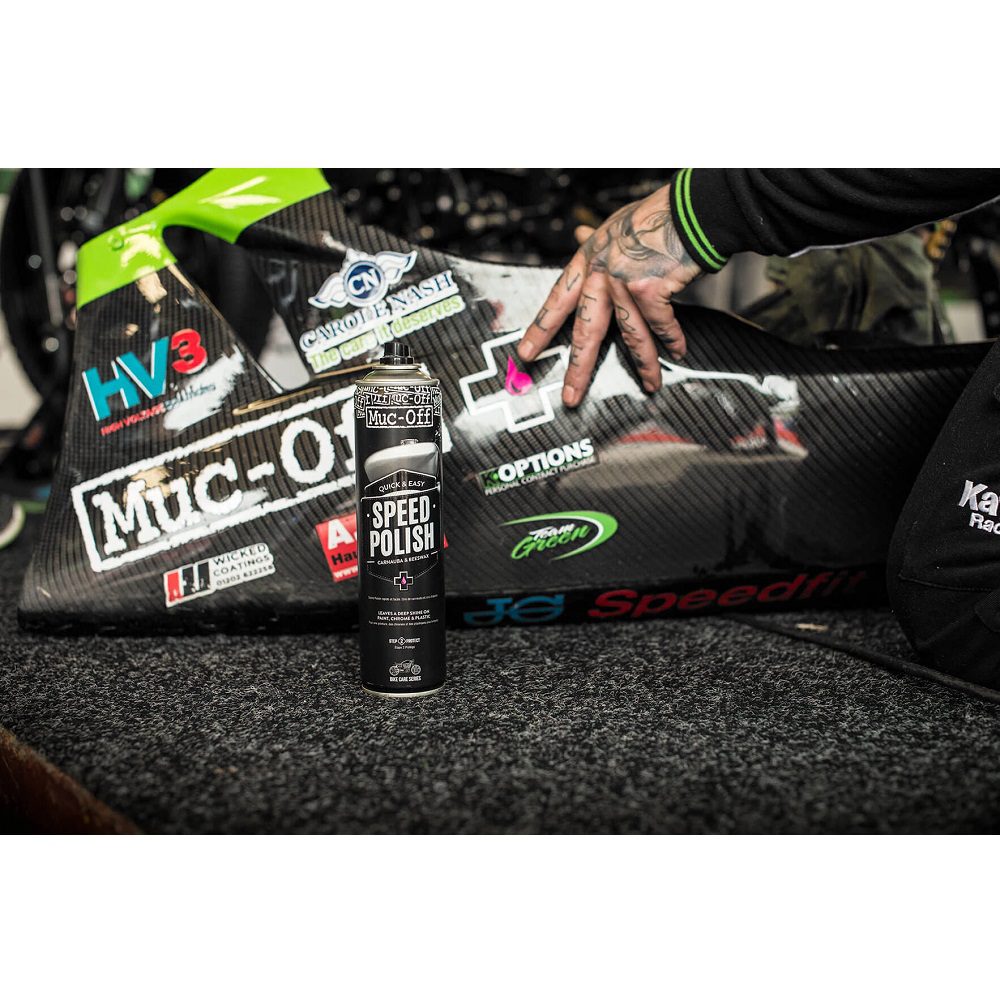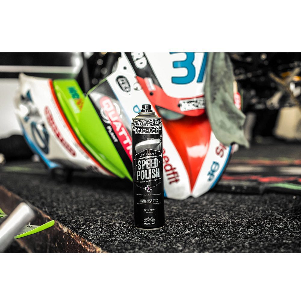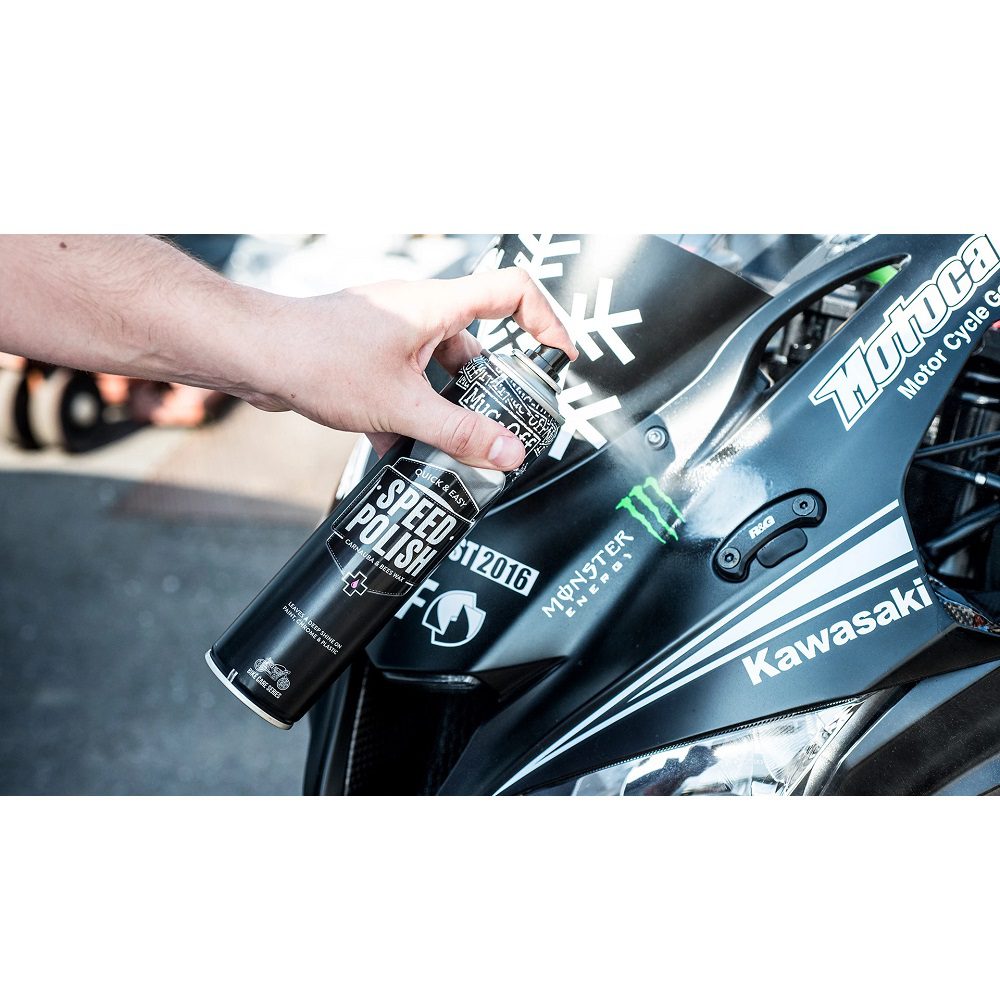 For riders looking to complete their cleaning ritual. The Muc-Off Speed Polish is a quick, easy to use motorcycle polish and wax in one. It has been specifically formulated to leave a hydrophobic water resistant barrier on all of your motorcycle’s bodywork and metal parts.