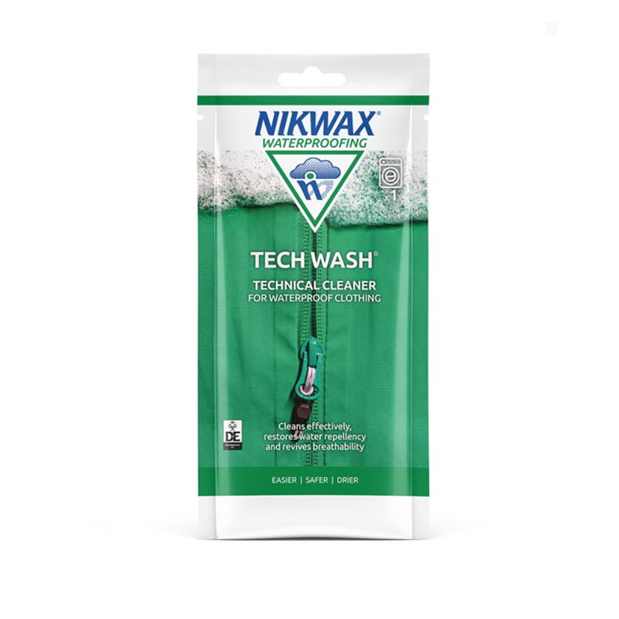 The Nikwax Tech Wash Pouch is a market leading cleaner designed to revitalise water repellency and breathability of waterproof gear. Easy to use in your washing machine or by hand. For cleaning outdoor gear.