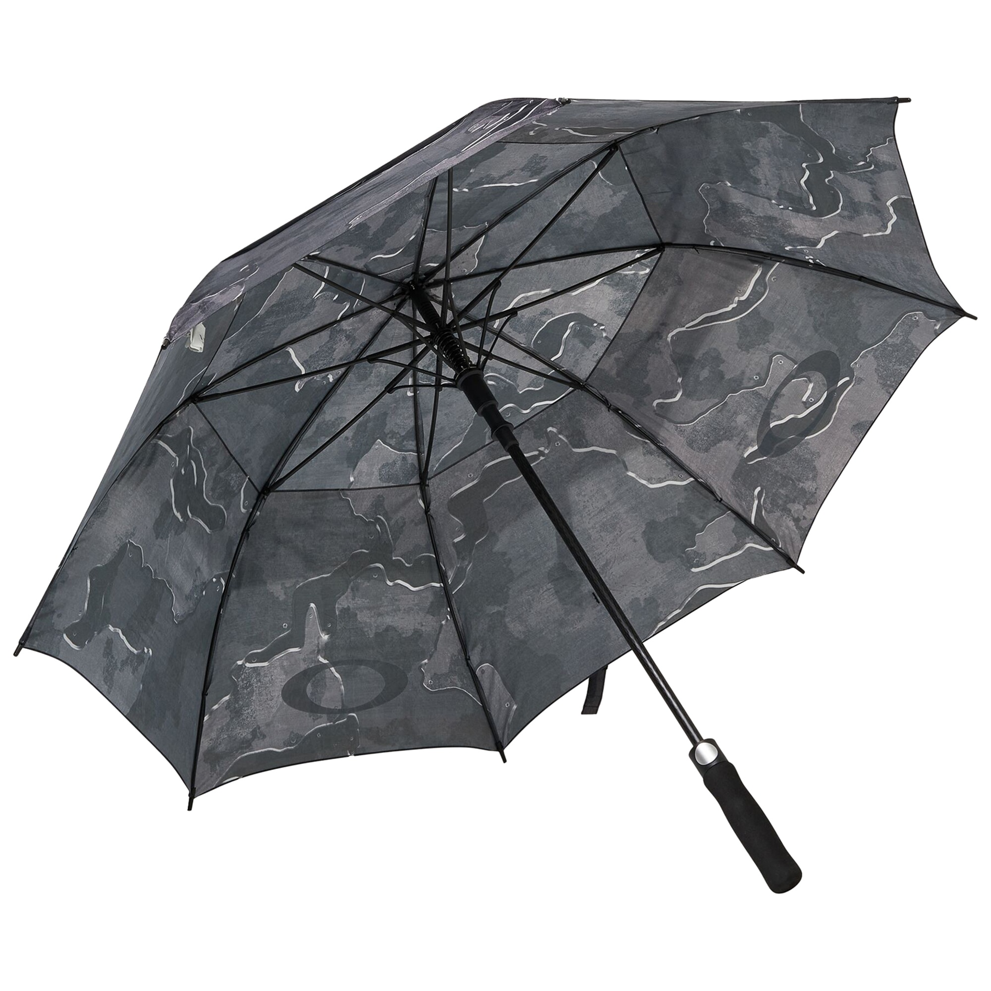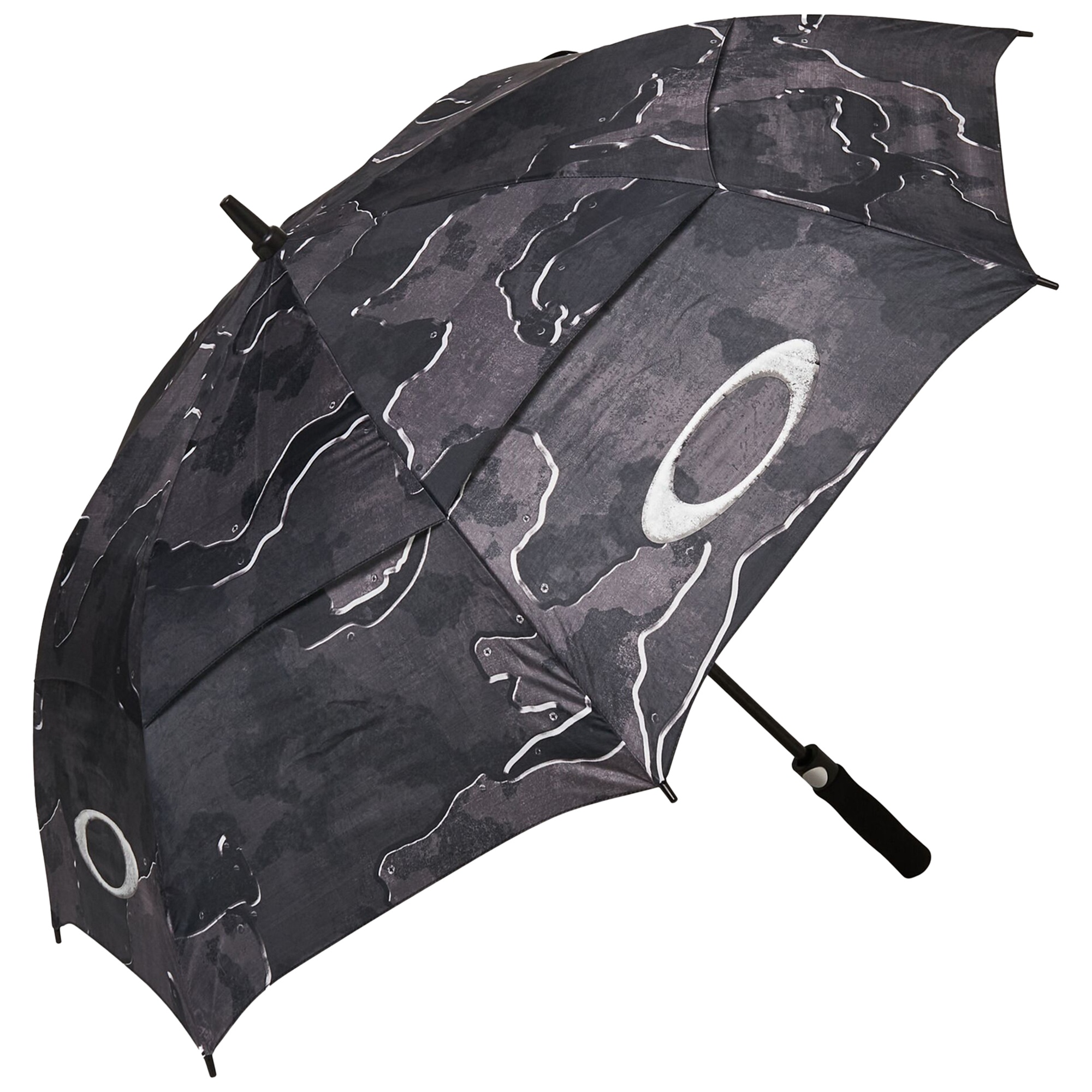 Rainy days just got stylish. The Oakley Windproof Umbrella is your thoughtfully-designed, hand-held protection against stormy days and drizzly nights. Along with its edgy, camo print and metallic Oakley Ellipse logo, this umbrella features a distinct, layered venting system which lets wind pass through (while keeping rain away). Plus, it features an EVA foam grip for comfy carrying and a velcro closure for easy stowing when the sun comes out to play.