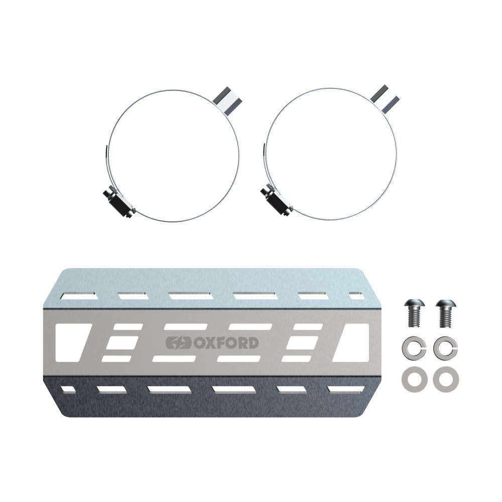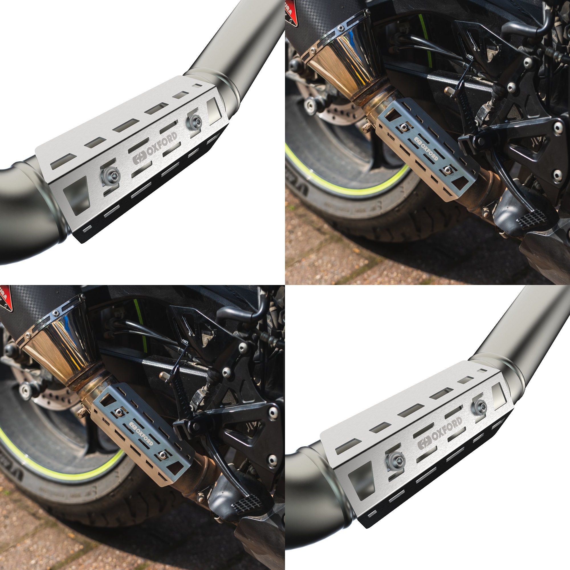 The Oxford motorcycle exhaust heat shield offers thermal protection by deflecting radiated exhaust heat and guards against yourself, your clothing or your accessories from accidentally touching a hot exhaust system.